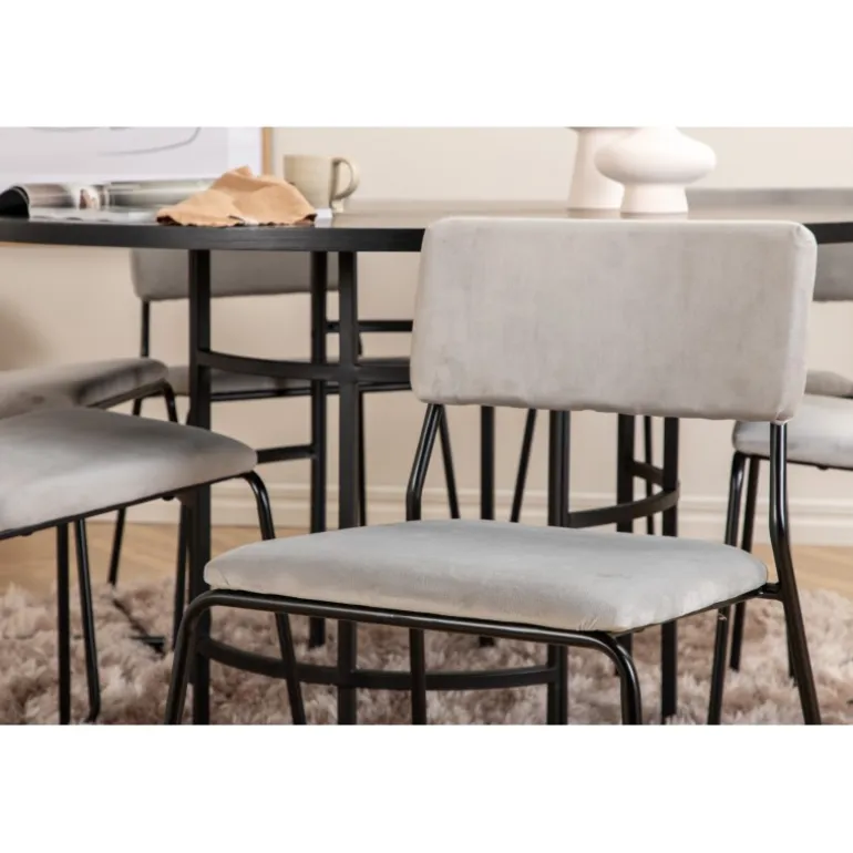 - Komfortable stole: Lysegrå fløjlsstof og smalle jernben for stil og komfort.