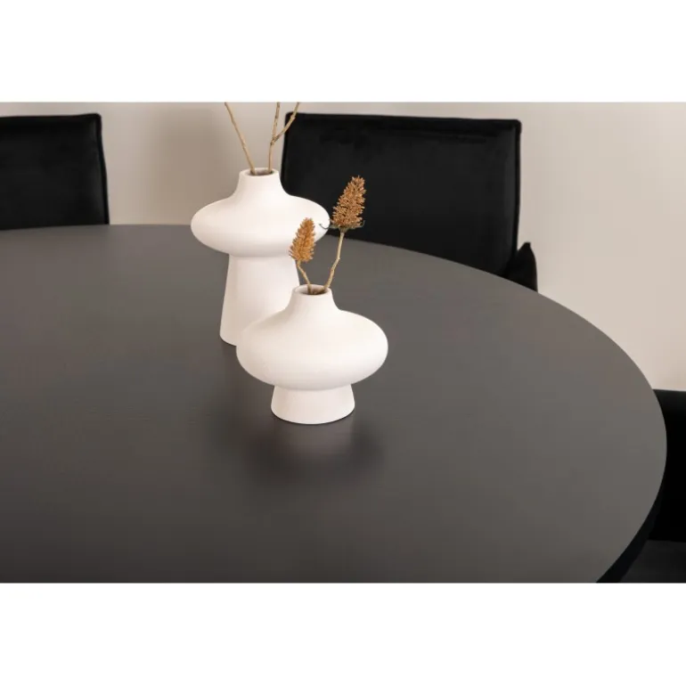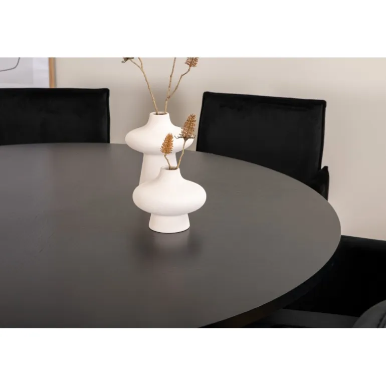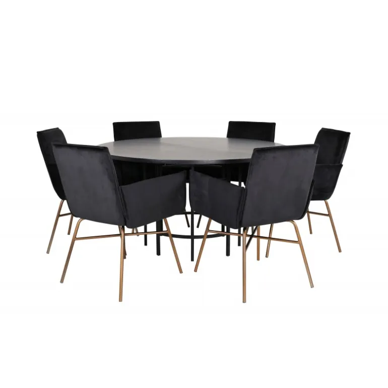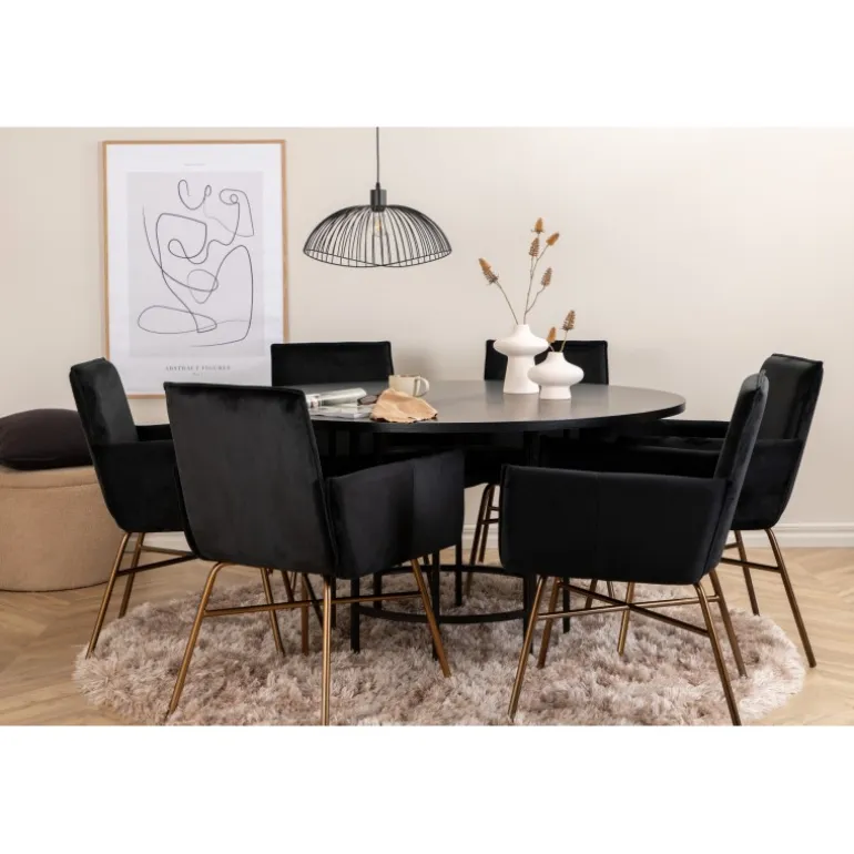 Copenhagen, vores populære runde spisebord med en smuk bordplade i sort MDF med finer og en dekorativ, cylindrisk formet underdel i sort metal. Bordet er konsekvent i elegant sort farve, hvilket giver rummet et pompøst og selvsikkert udtryk, men samtidig let at matche med anden indretning. Bordets diameter: 140 cm, højde: 74 cm. Her er det matchet med 6 Petra spisebordsstole i luksuriøst design. Stolene har en behagelig sædedybde med sæde i sort fløjl og smalle stoleben i kobberfarvet jern. Stolens dimensioner: Højde: 87 cm, sædehøjde: 48 cm, bredde: 57 cm, dybde: 60 cm. Et behageligt Spisebordssæt til alle lejligheder!
