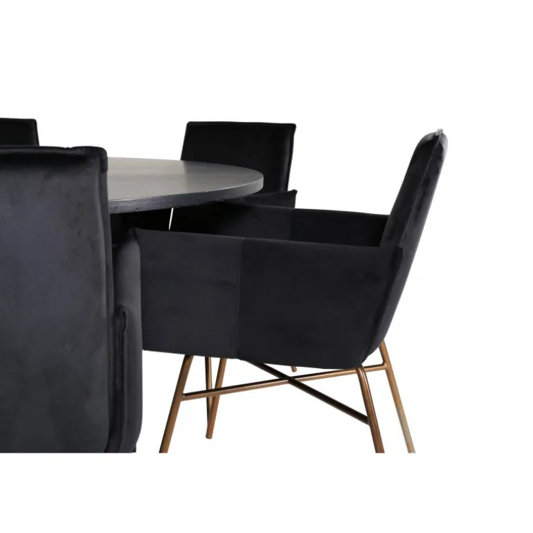 - Høj Kvalitet: Bordplade i sort MDF med finer og robuste stole i sort fløjl og kobberfarvet jern.