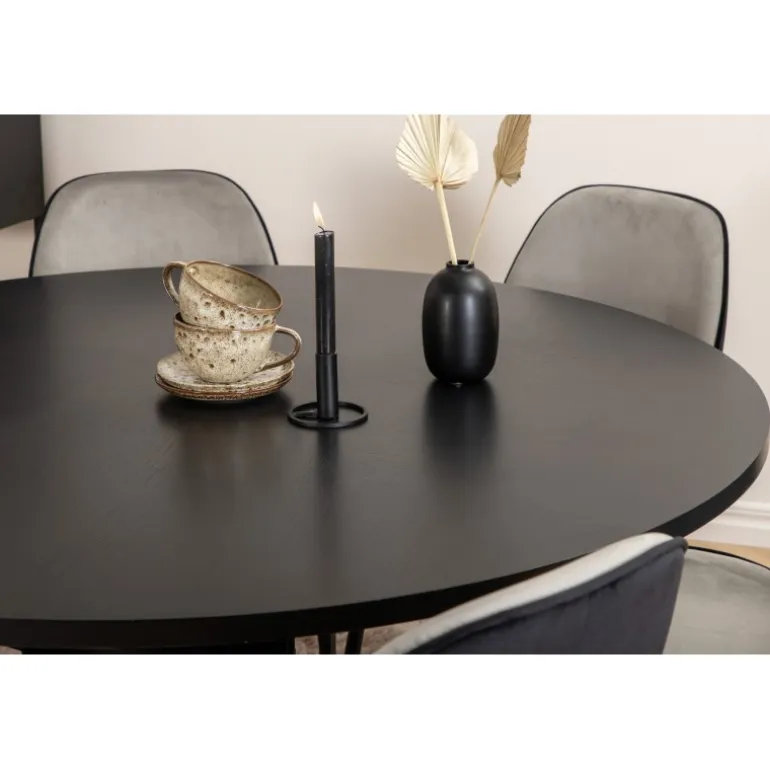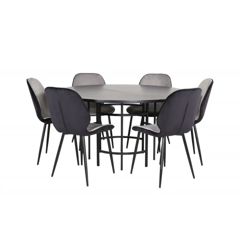 Copenhagen, vores populære runde spisebord med en smuk bordplade i sort MDF med finer og en dekorativ, cylindrisk formet understel i sort metal. Bordet er konsekvent i en elegant sort farve, som giver rummet et pompøst og stilfuldt udtryk, men som også er let at matche med anden indretning. Bordets diameter: 140 cm, højde: 74 cm. Her er det matchet med 6 Emma spisestole i moderne design. Stolens ben er i sort jern, og sæderne er i lysegrå og sort fløjl, hvilket giver en lækker varierende glans til rummet. Stolens dimensioner: Højde: 89 cm, sædehøjde: 45 cm, bredde: 47 cm, dybde: 57 cm.