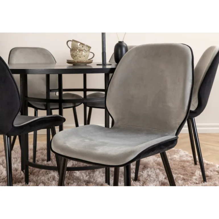 - Komplet Sæt: Inkluderer 6 Emma spisestole i lysegrå og sort fløjl.
