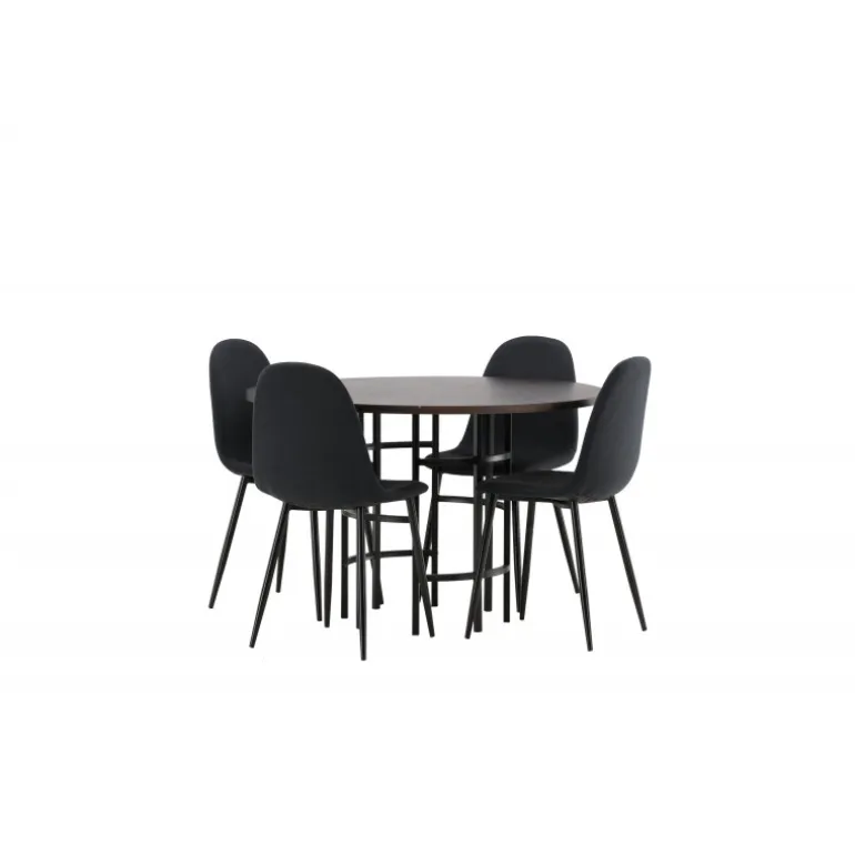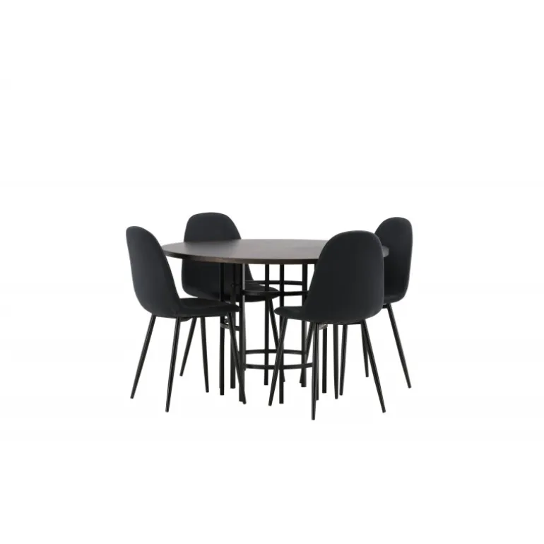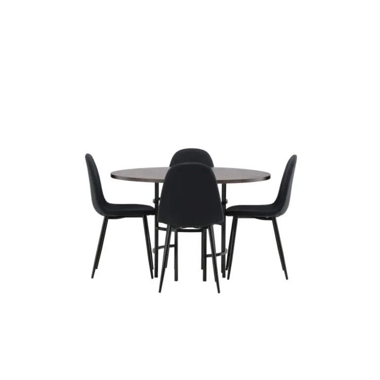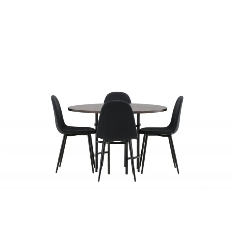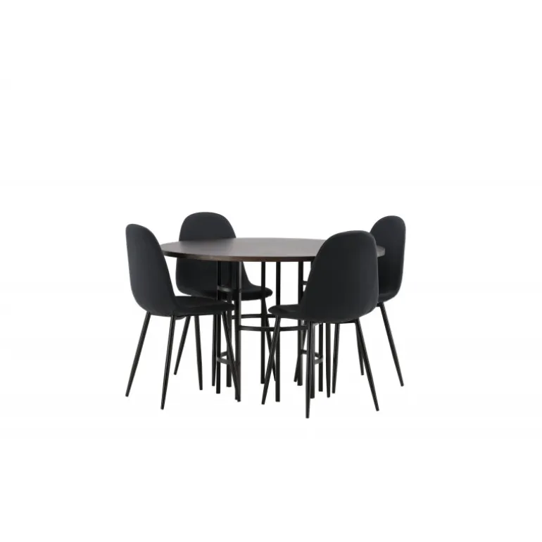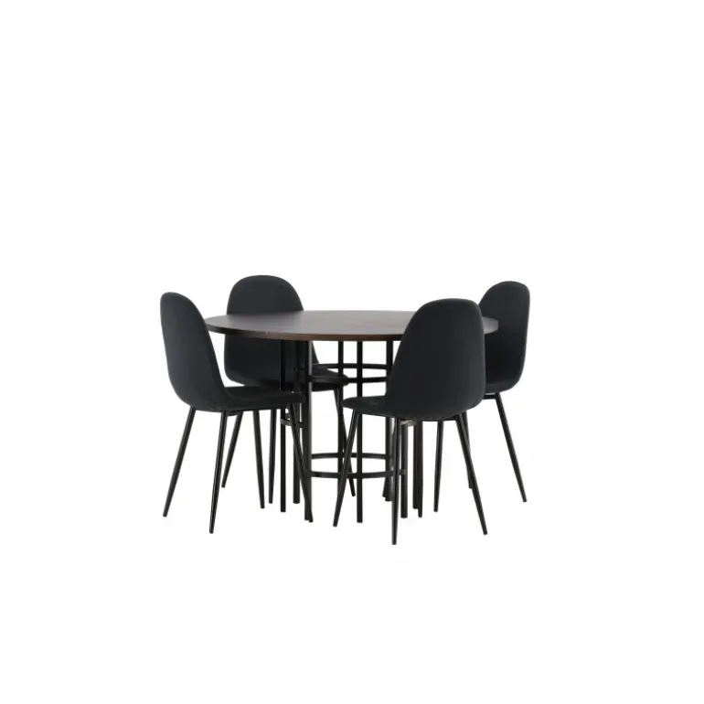 Stilfuldt, moderne og tidløst – et Spisebordssæt der imponerer! Dette trend-sikre spisebord fra Copenhagen-serien tilhører Furniture Fashion-kollektionen og har en smuk brun bordplade i MDF med finer og en dekorativ, cylinderformet base i sort metal. Her sammen med vores komfortable stole fra Polar-serien. Stolen har et fuldt polstret design med en afrundet ryg og sæde i sort polyesterstof med blød polstring og ben i sort pulverlakeret metal. Undgå at gå på kompromis mellem komfort og design!