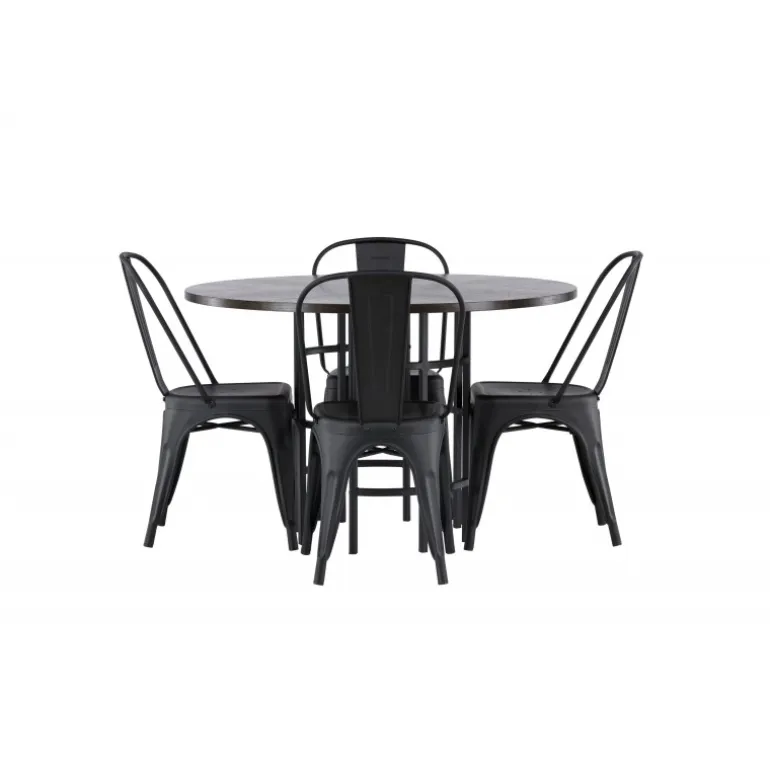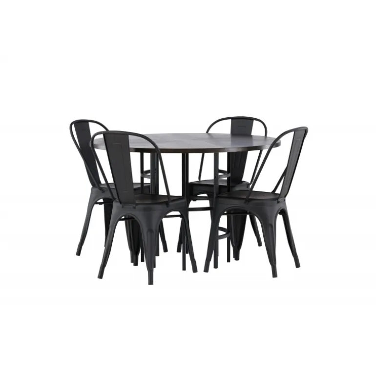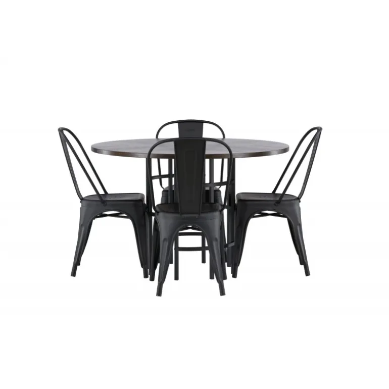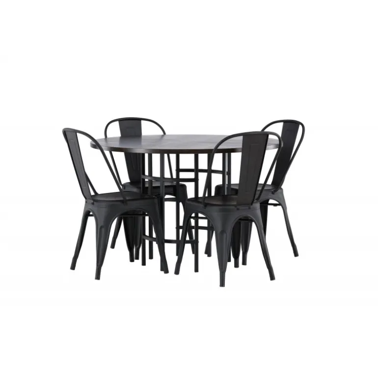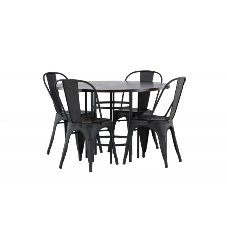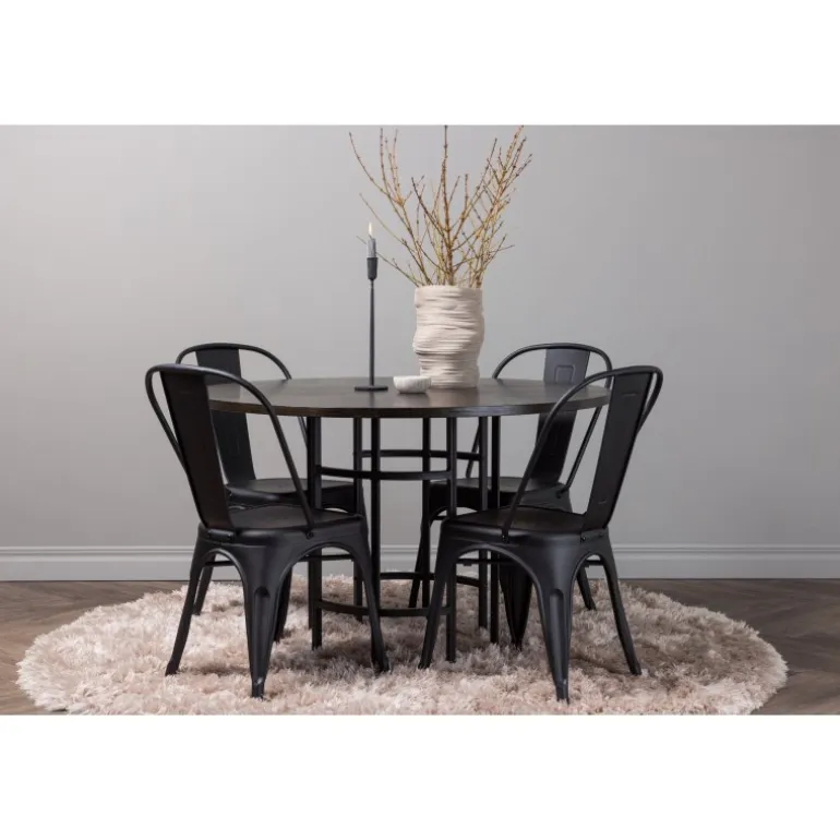 Trend-sikkert og smart Spisebordssæt til enhver lejlighed! Vores runde spisebord Copenhagen har en smuk brun bordplade i MDF med finer og en dekorativ, cylinderformet base i sort metal. Her sammen med vores sorte spisebordsstole fra Tempe-serien. Stolen har let udfladede ben, der glat møder sædet og ryglænet i et stilfuldt design, konsekvent lavet af sort metal. Indret hjemmets hjerte indbydende! Bordets dimensioner: 115 cm.