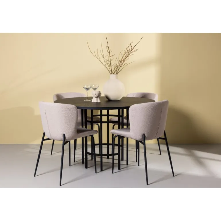 Et tidløst Spisebordssæt med bløde former! Vores runde spisebord Copenhagen har en elegant, sort bordplade i MDF og en dekorativ, cylinderformet base i sort metal. Her i en stilfuld kombination med vores trendy spisebordsstole fra Modesto-serien. Stolen er fuldt polstret i gråt, plysset stof med stilfulde smalle ben i sort metal. Den let afrundede ryg og den polstrede sædepude giver ekstra komfort og forlænger hyggelige måltider rundt om bordet. Her mødes industriel design med bløde former! Bordets diameter: 115 cm.