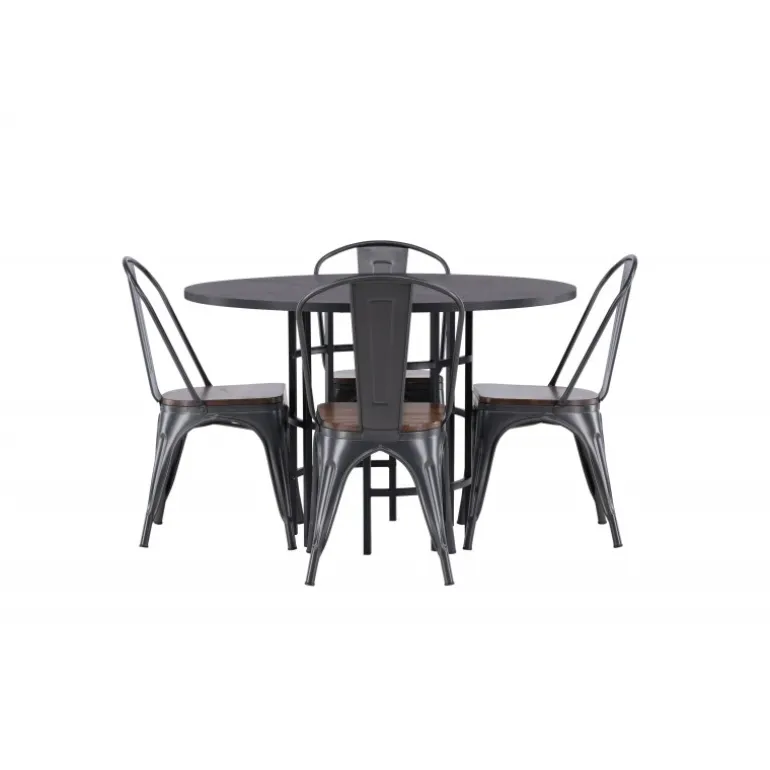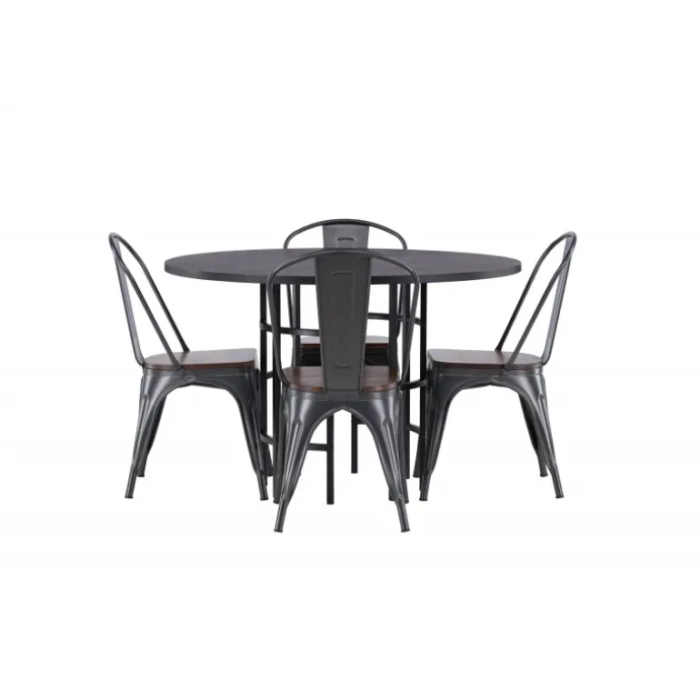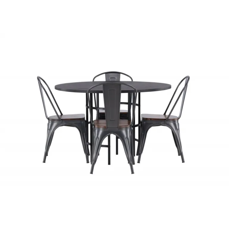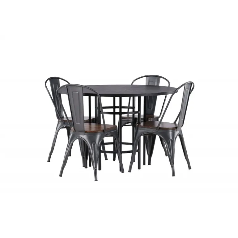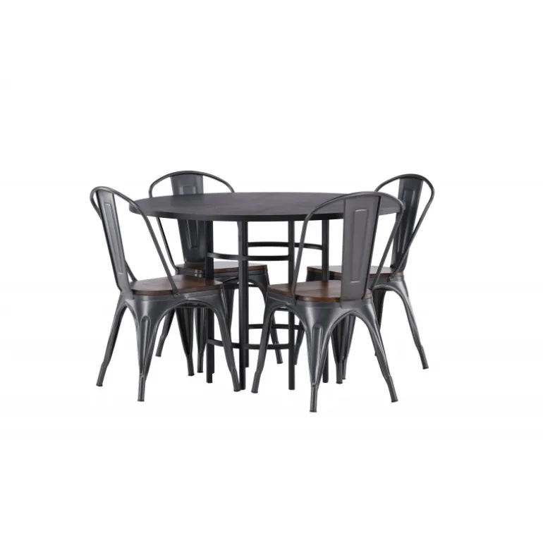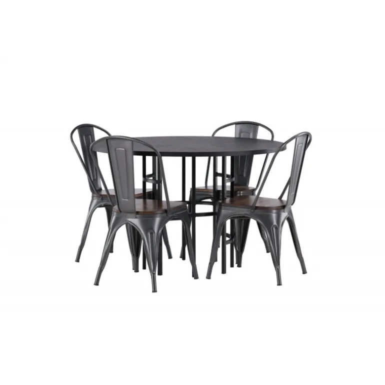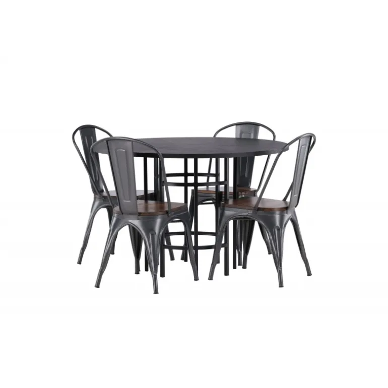 Industrielt design møder skandinavisk elegance! Vores runde spisebord Copenhagen har en elegant, sort bordplade i MDF og en dekorativ, cylinderformet base i sort metal. Kombineret med stilfulde spisebordsstole fra Tempe-serien. Stolen har et klassisk design med let skråtstillede ben i mørkegråt stål og et sæde i mørkt træ. Stilfuldt og luksuriøst! Bordmål: 115cm.
