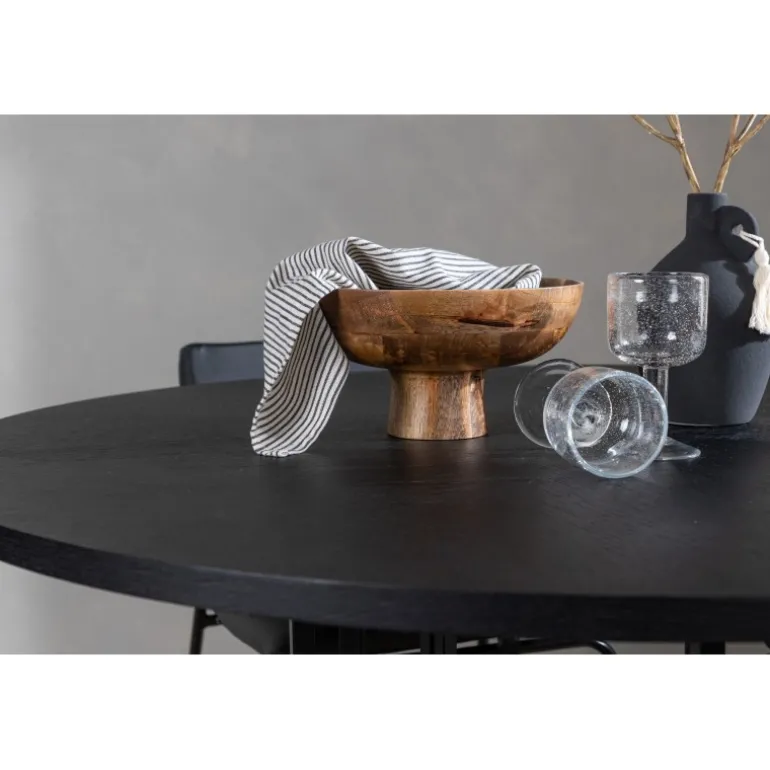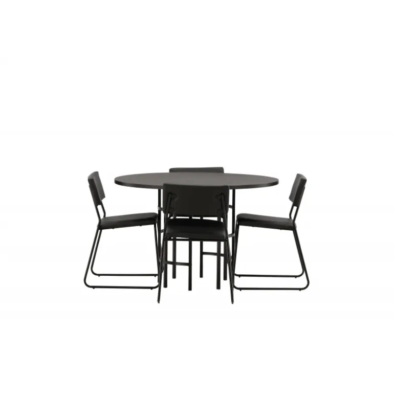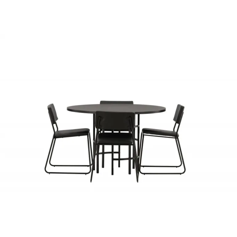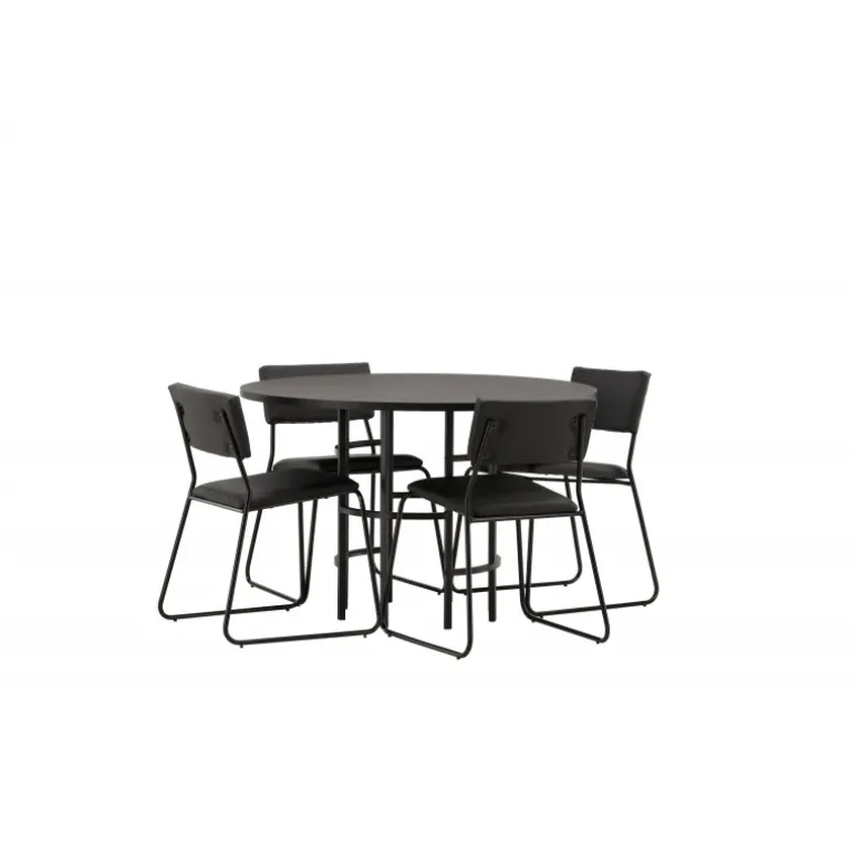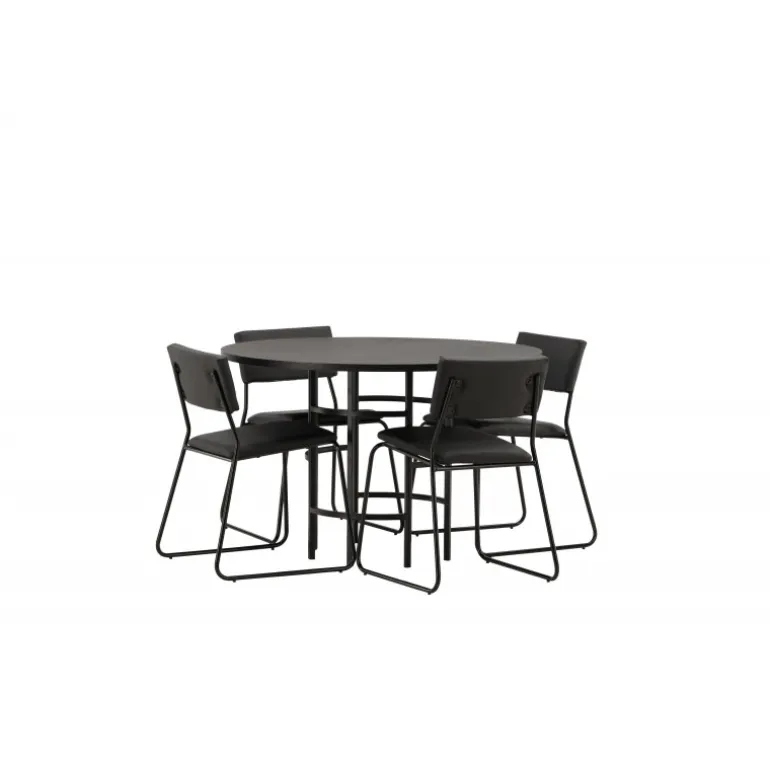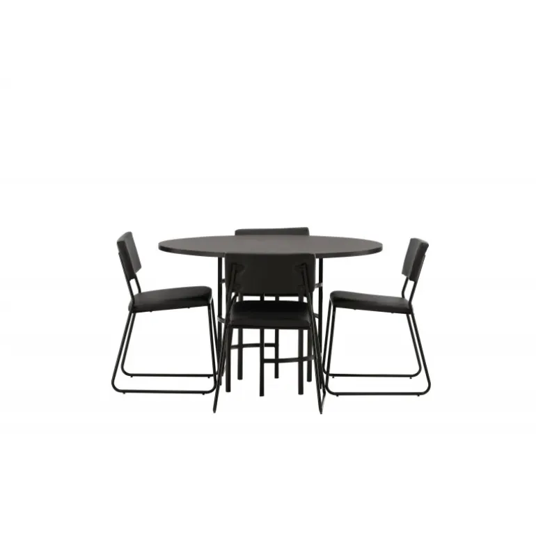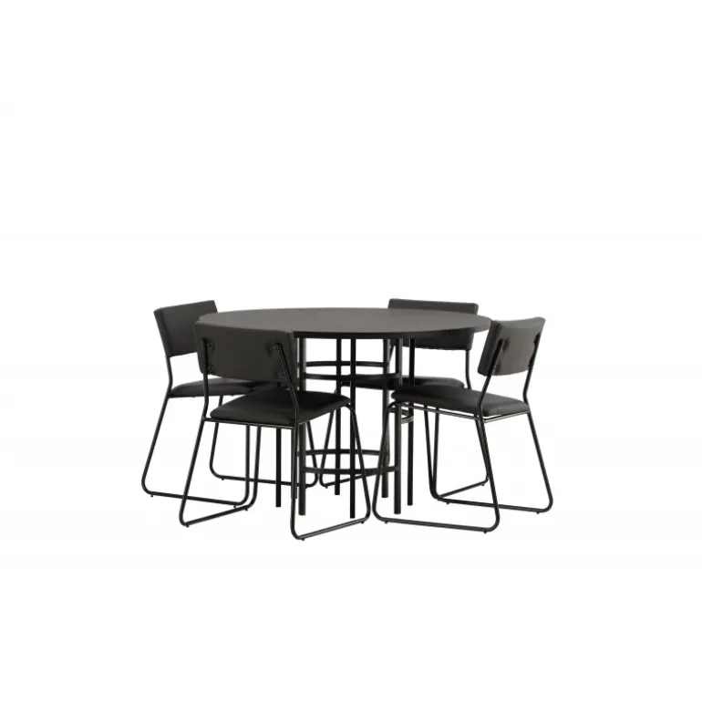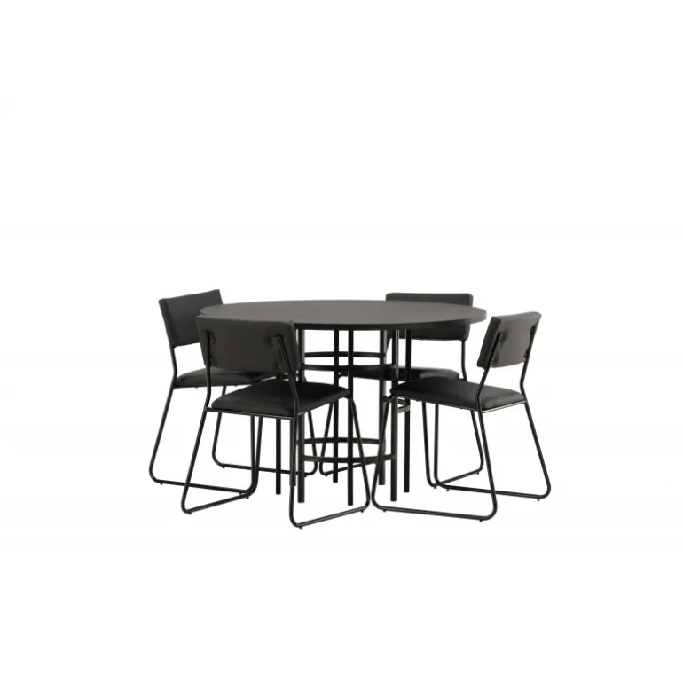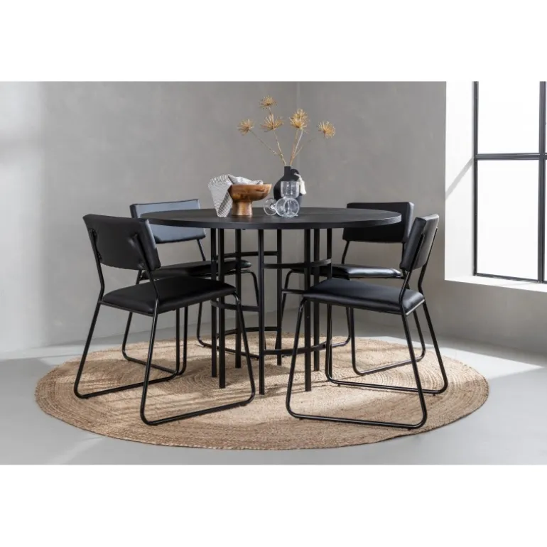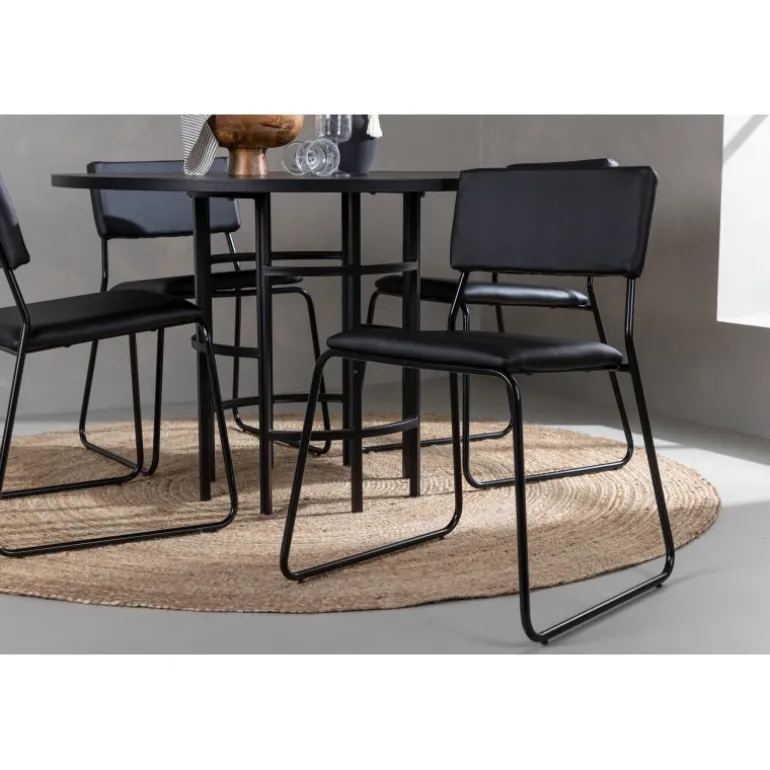 Skab en moderne atmosfære i dit hjem med et rundt spisebordssæt! Dette tidløse spisebord fra Copenhagen-serien tilhører Furniture Fashion-kollektionen og har en sodet sort bordplade i MDF med finer og en dekorativ, cylinderformet base i sort metal. Her sammen med vores moderne spisebordsstole fra Kenth-serien. Stolen har et minimalistisk, moderne design, der skaber en luftig følelse i rummet. Ryglænet og sædet er i sort PU-læder og polyester, og de smalle ben er i sort jern. Nyd hyggelige måltider i fremtiden!