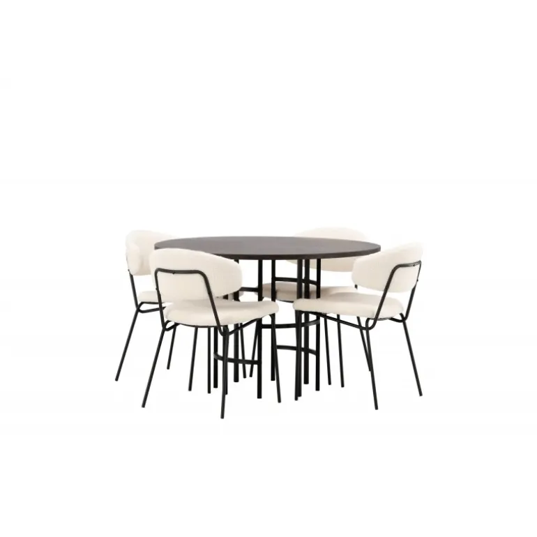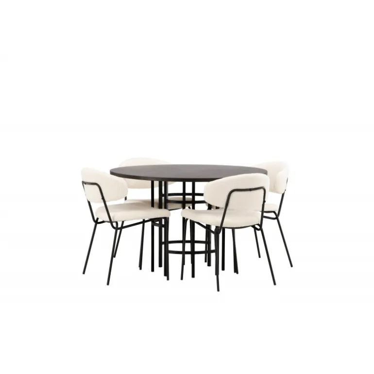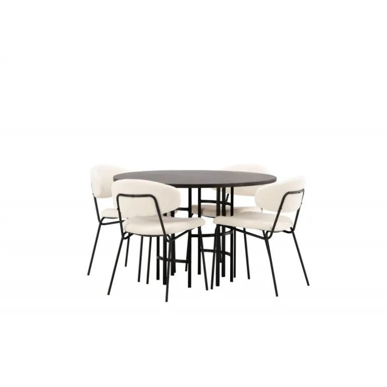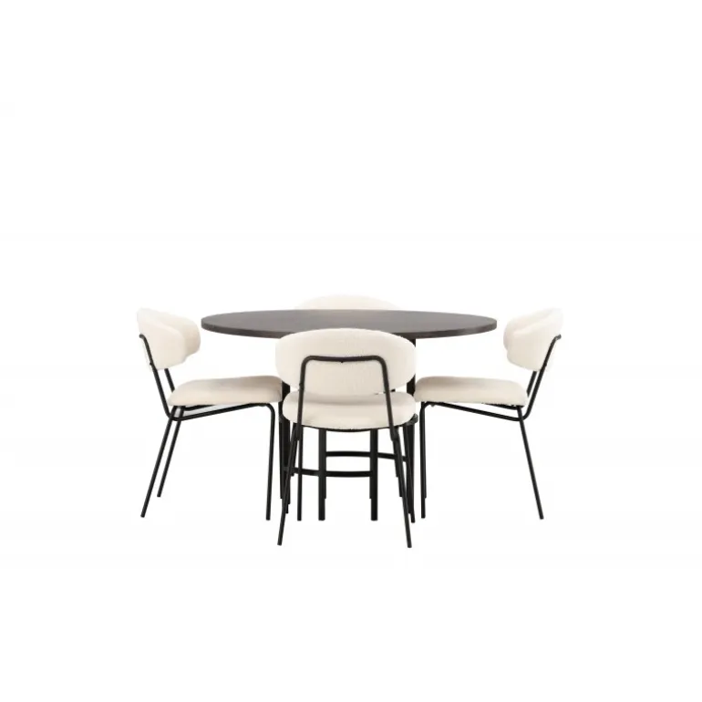 Skab en moderne og indbydende atmosfære i dit hjem med Copenhagen Rundt Spisestuesæt! Dette hyggelige sæt fra Copenhagen-serien er en del af Furniture Fashion-kollektionen og byder på et smukt brunt bord i MDF med finer og en dekorativ, cylinderformet base i sort metal. Sammen med vores dejlige stole fra Chico-serien, der har et minimalistisk og komfortabelt design med ryg og sæde i hvidt bouclé-stof og en smal ramme i sort stål, får du et blændende midtpunkt til at imponere dine gæster!