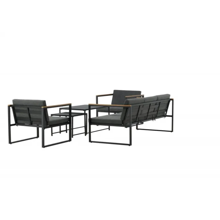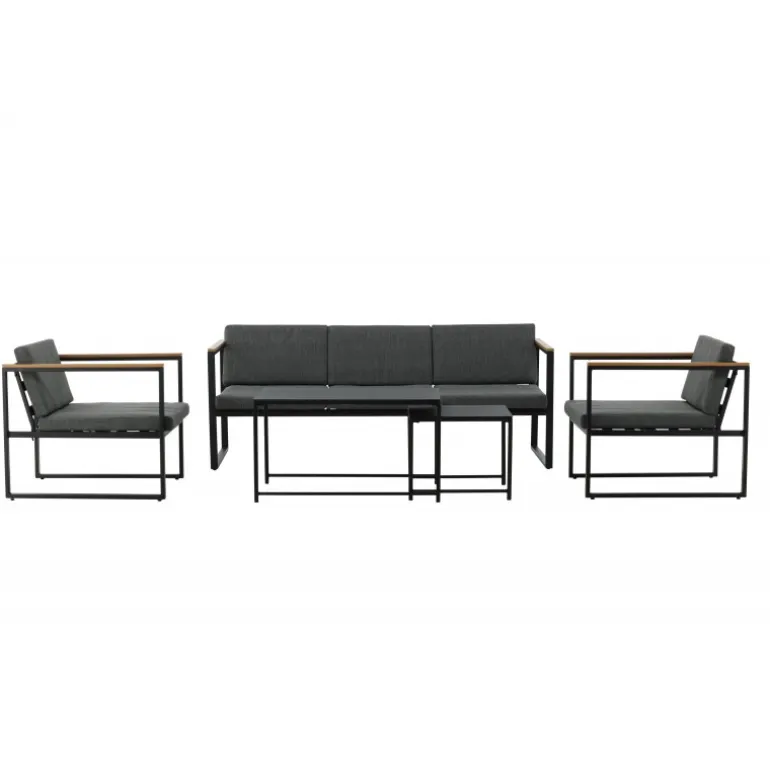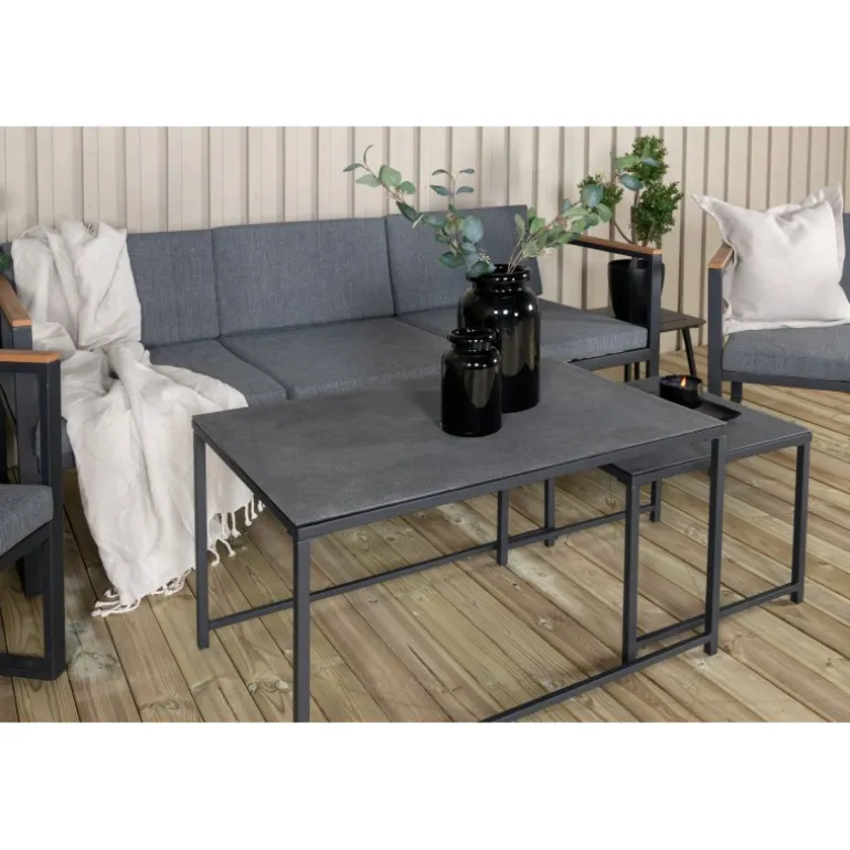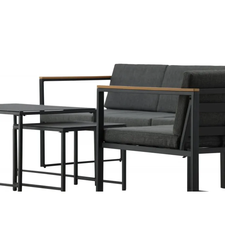 Dakar sofasæt er en elegant og stilfuld gruppe i sort stål med tilhørende borde med topplader i sprayglas. Holdbare puder i grå medfølger, og sættet kan rumme op til 5 siddende gæster. Bordmål: 90/50×60/50×50/43 cm. Sofamål: 188x80x67 cm. SÆDE: 180x64x34 cm. Ingen montering krævet.