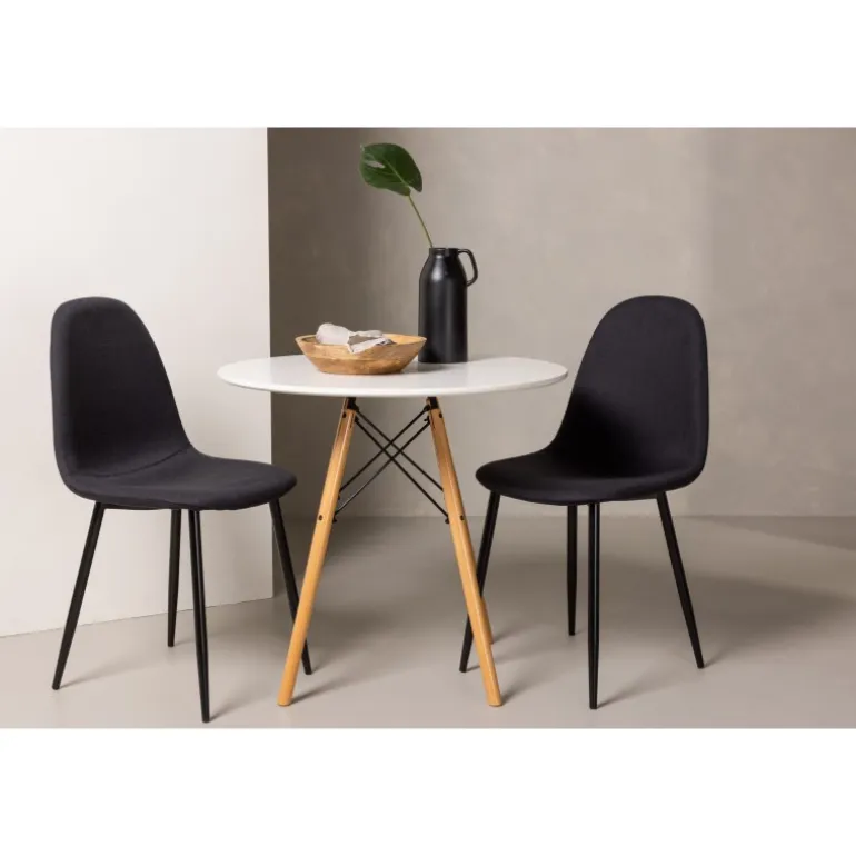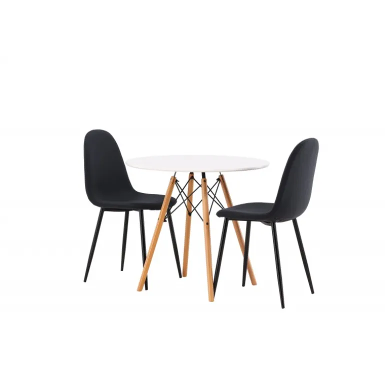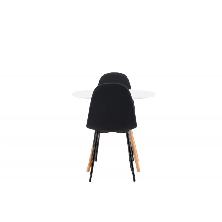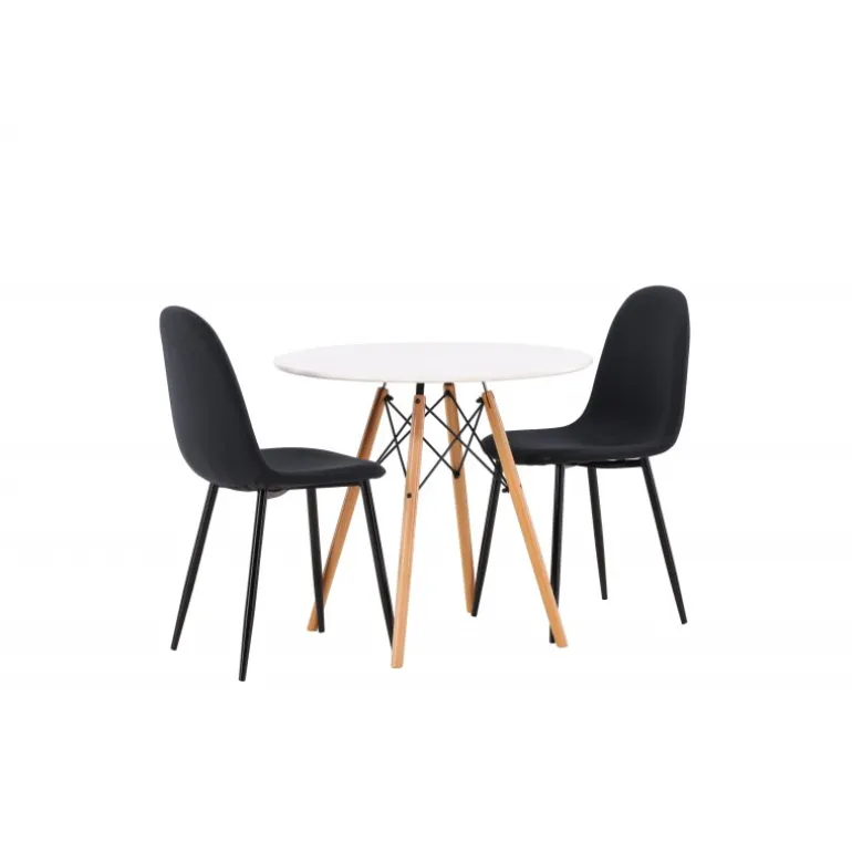 Sid både smart og komfortabelt! Det runde spisebord Danburi har et klassisk design med en rund bordplade i hvid MDF og let udadgående ben i bøgetræ med dekorative detaljer i sort stål. Her i en fantastisk kombination med sorte spisebordsstole fra Polar serien. Stolen har et fuldt polstret design, ben i sort pulverlakeret metal og en rundet ryg og sæde i sort polyesterstof med blød polstring. Dette sæt passer perfekt i det mindre køkken! Bordets diameter: 60 cm.