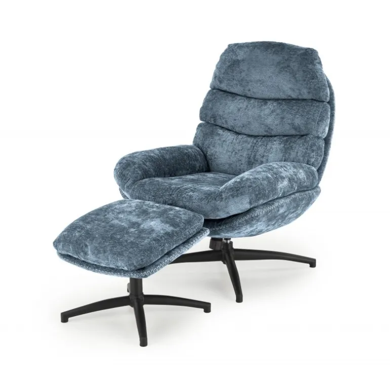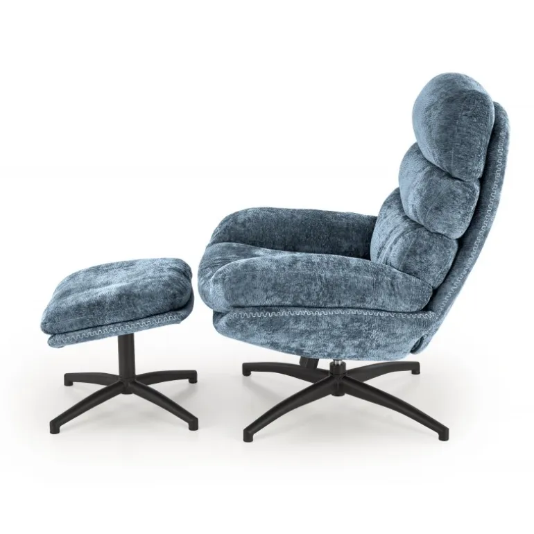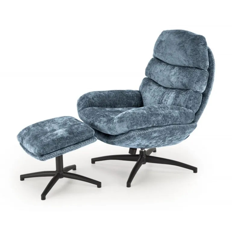 Oplev ultimativ komfort med DARIO lænestol med skammel i elegant Blå. Denne lænestol kommer med en praktisk skammel og har en behagelig vuggefunktion, der giver dig mulighed for at slappe af og nyde enhver stund. Fremstillet af slidstærkt stof og pulverlakeret stål, sikrer denne stol både stil og holdbarhed. Perfekt til afslapning i stuen, kontoret eller læsehjørnet. Med DARIO lænestolen får du en kombination af moderne design og funktionalitet, der passer ind i ethvert hjem.