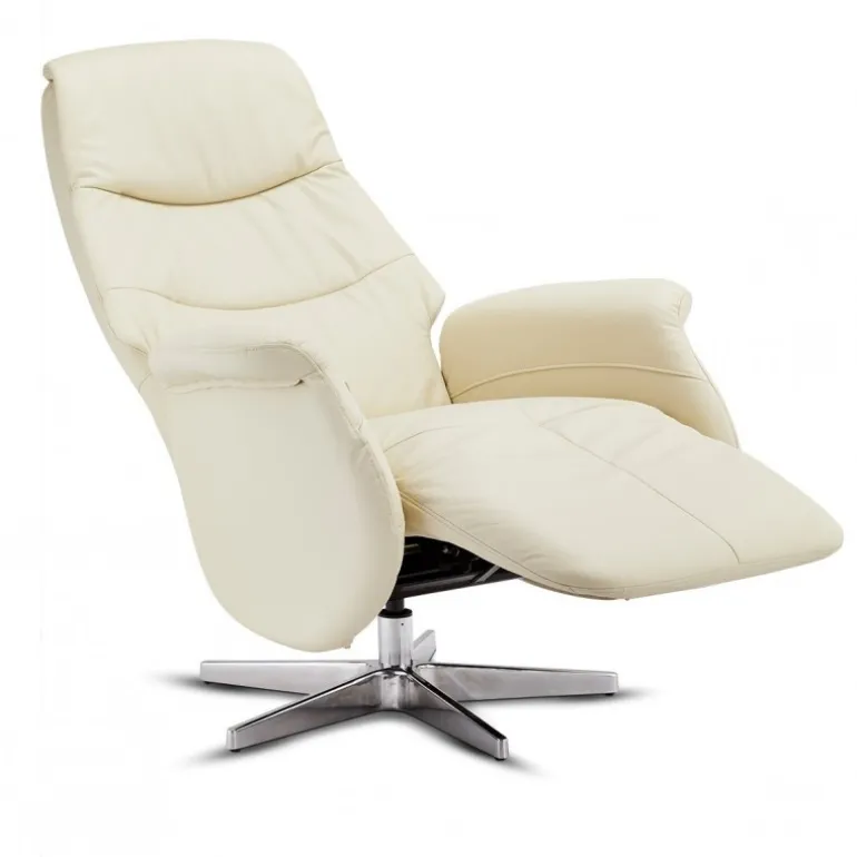 Delta Recliner i Cream læder er en elegant og komfortabel lænestol med manuelle funktioner. Den er betrukket med en kombination af ægte læder og PVC for et eksklusivt udtryk, men til en overkommelig pris. Med sin drejefunktion, justerbare nakkestøtte og integreret fodskammel er denne stol ideel til afslapning i hjemmet.