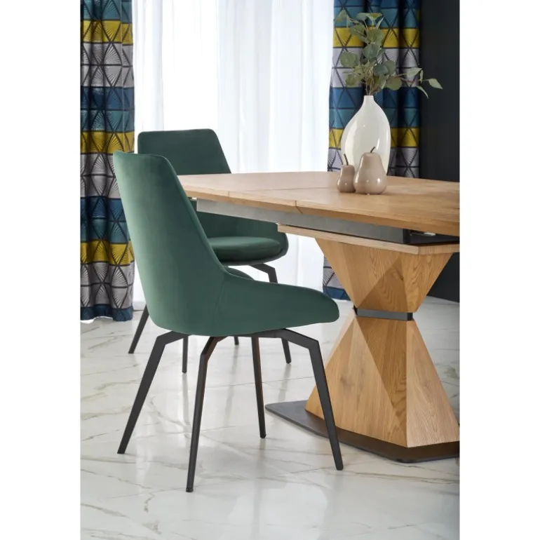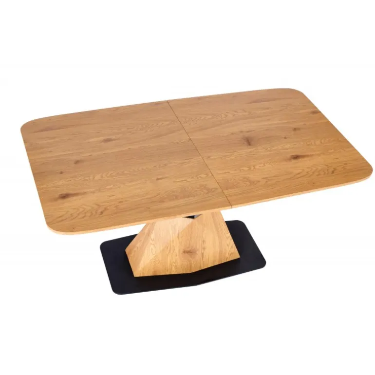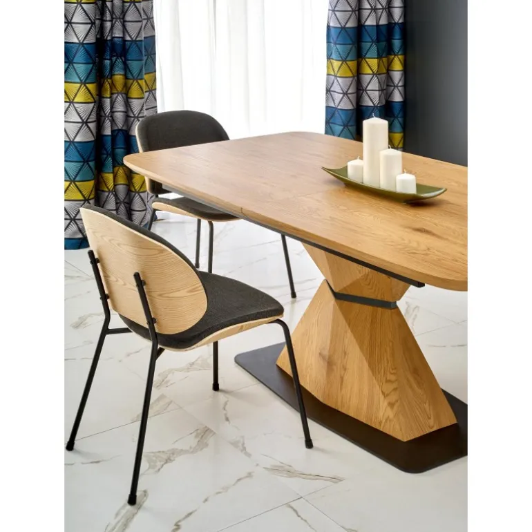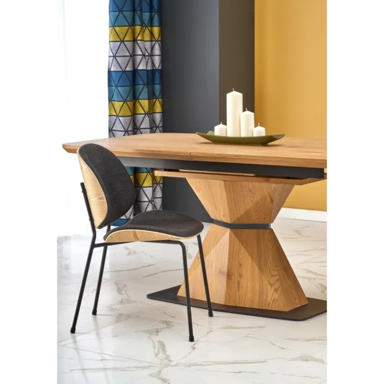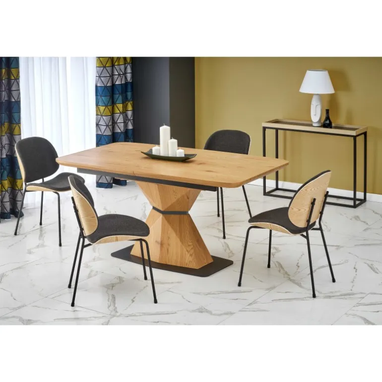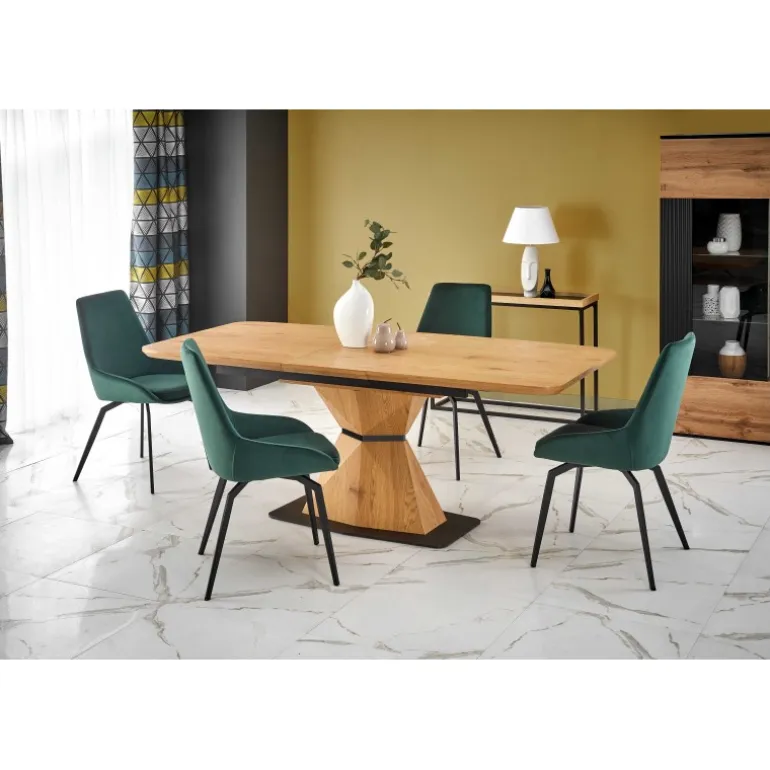Oplev tidløs elegance med vores DIAMOND bord i gyldent egetræ. Dette smukke forlængelsesbord er designet til at imødekomme dine spisebehov og tilføje et strejf af luksus til dit hjem. Bordpladen er lavet af lamineret MDF og benene af pulverlakeret stål, hvilket sikrer både holdbarhed og stil. Med dimensioner på 160-200/89/76 cm er det perfekt til både små og store sammenkomster. Den gyldne egetræsfarve på både top og ben giver en sammenhængende og sofistikeret æstetik.