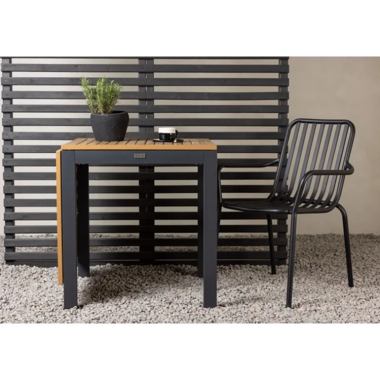 Diego cafébordet er lige så smart som det er stilfuldt med et smagfuldt skandinavisk design! Bordpladen er i brun aintwood og benene i sort aluminium. De lige nordiske former er tidløse, og med simpel konstruktion kan du nemt folde ud eller ind forlængelsespladerne langs siderne efter behov. Perfekt til morgenmad eller kaffe udenfor på en solrig sommerdag!
