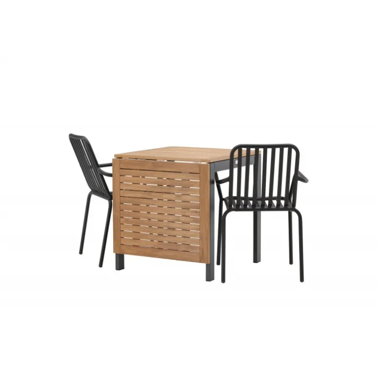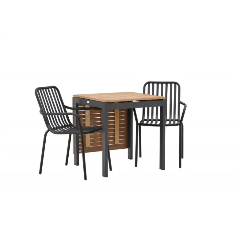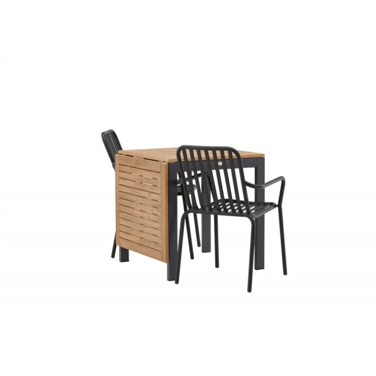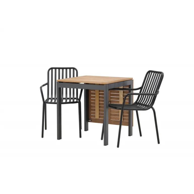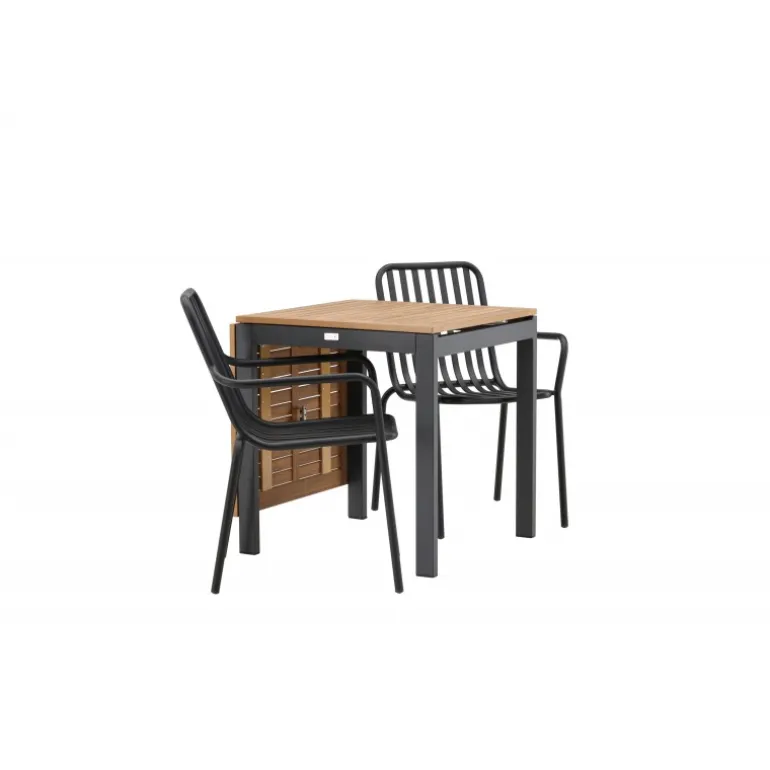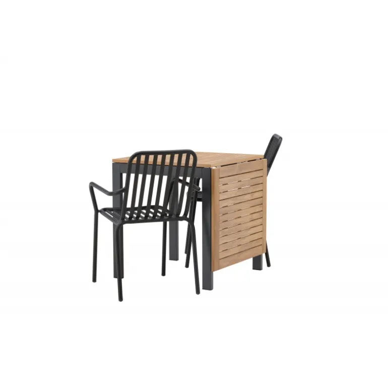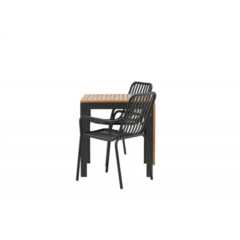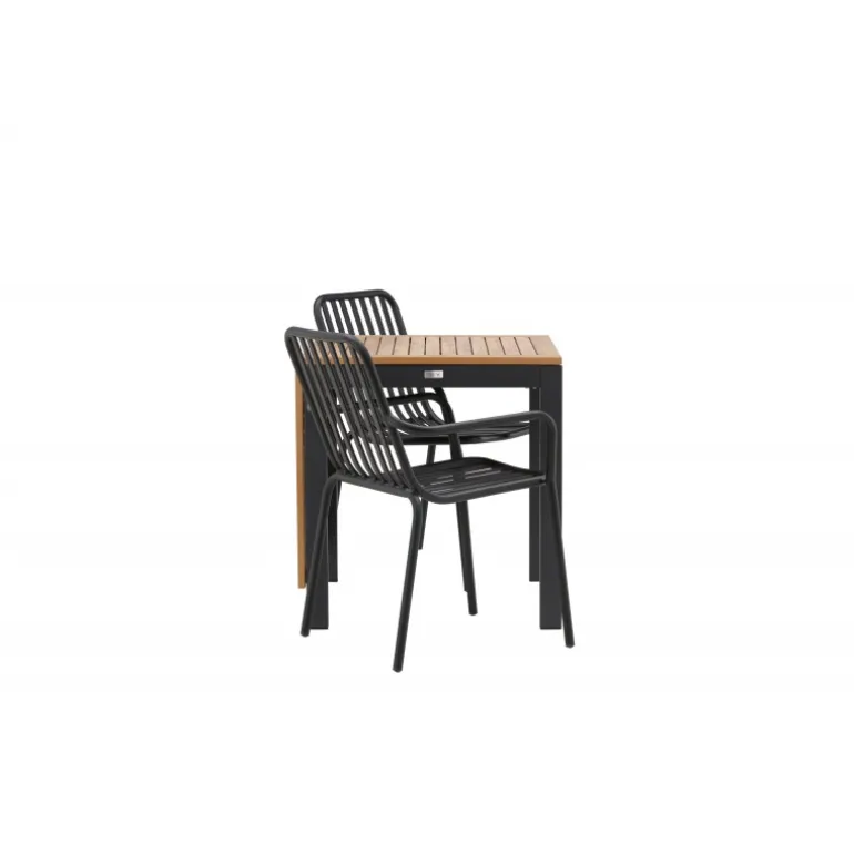 Charmerende, praktisk og nemt at tilpasse cafégruppe med alle de rette funktioner! Diego cafébordet er lige så smart som det er stilfuldt med en bordplade i brun aintwood og ben i sort aluminium. Bordet har også en simpel konstruktion, der gør det nemt at folde ud eller ind udvidelsespladerne langs siderne. Her i perfekt match med 2 sorte spisestole fra serien Beijing. Stolen er i sort aluminium, har et ribbet design og integrerede armlæn for ekstra komfort! Her kan du nyde din kaffepause mest muligt! Bordmål: 130/70x70cm.