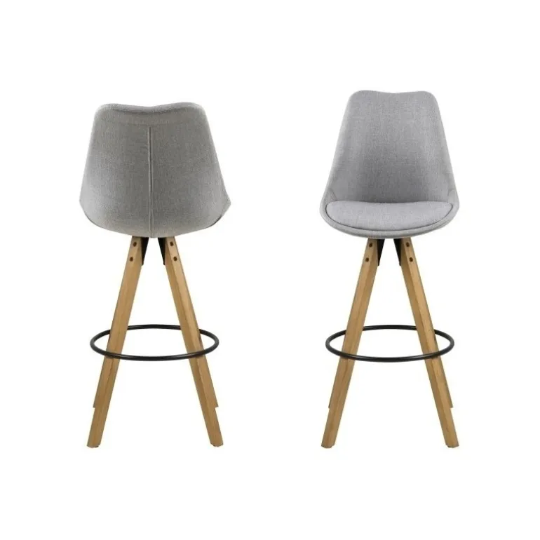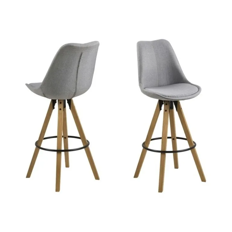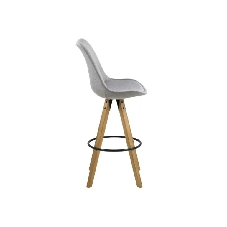 Moderne barstol med skalsæde i lysegråt stof. Denne barstol hviler på fire oliebehandlede træben og er udstyret med en solid fodstøtte i sortmalet metal. En lækker detalje er den sorte metalring der omkranser benene. Et lækkert design der passer ind i det smarte og stilrene hjem.
