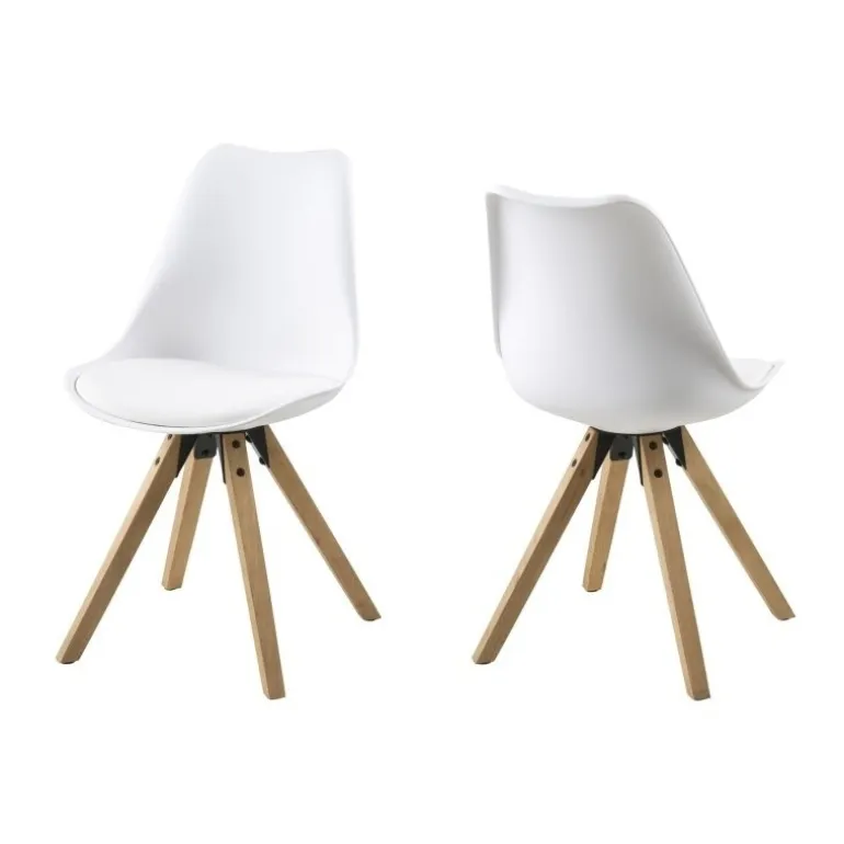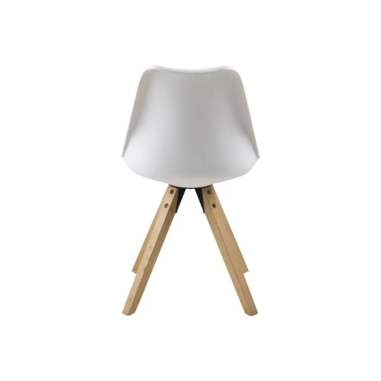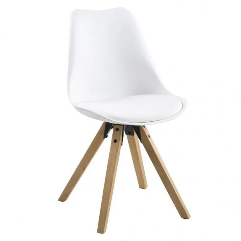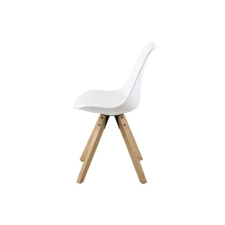 Moderne spisebordsstol i retrolook med hvid plastsæde polstret med skum og hvid tekstillæderbetræk. Stolen hviler på fire oliebehandlede træben, som sikrer en større grad af smudsresistens.