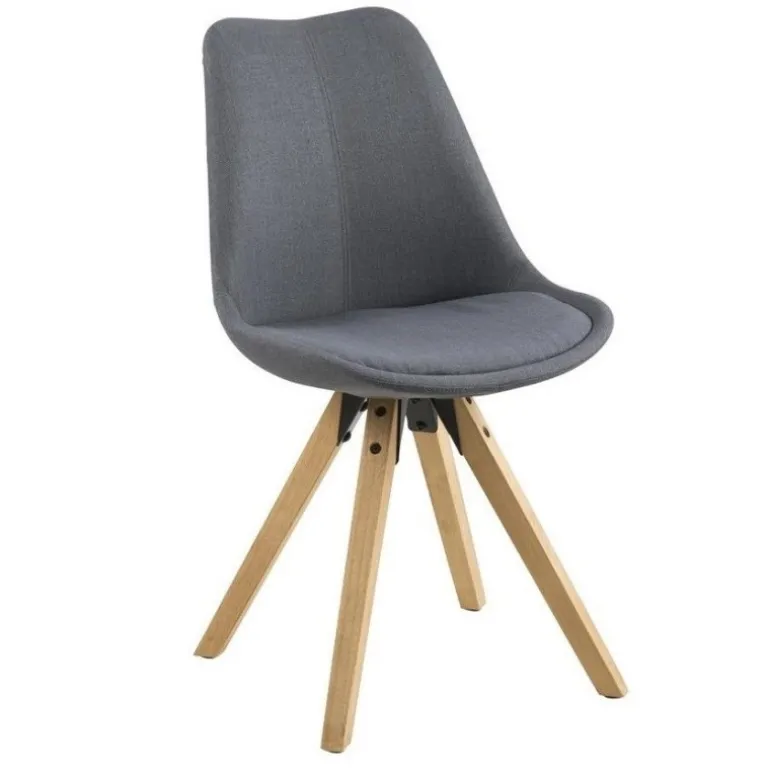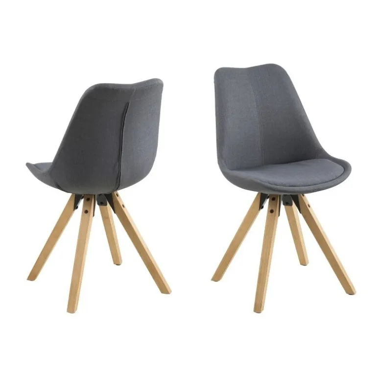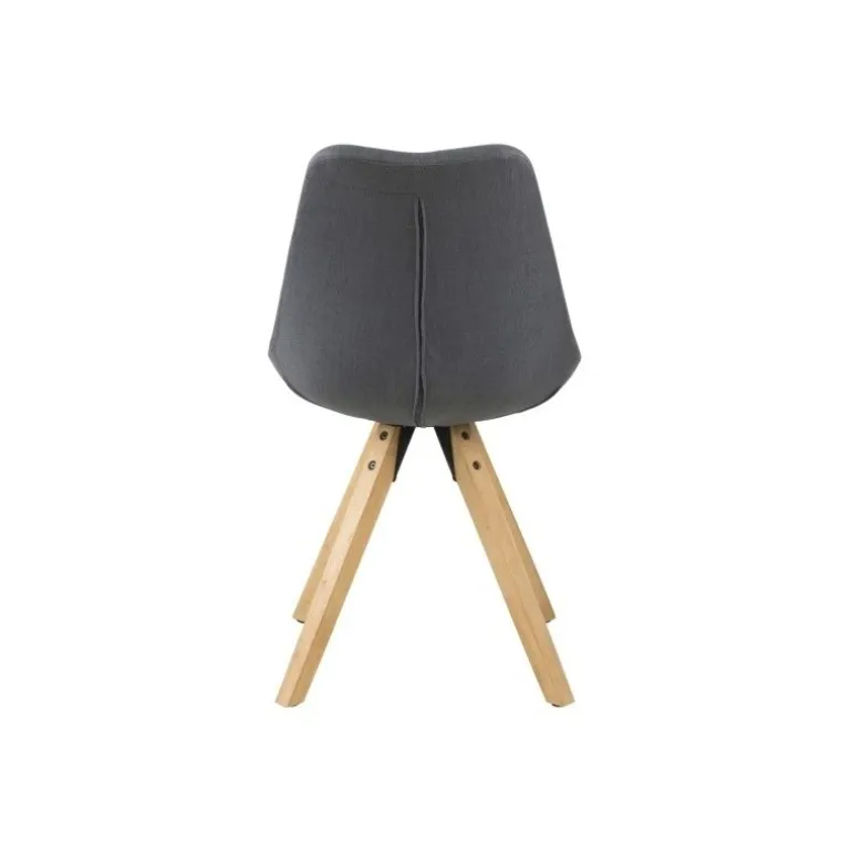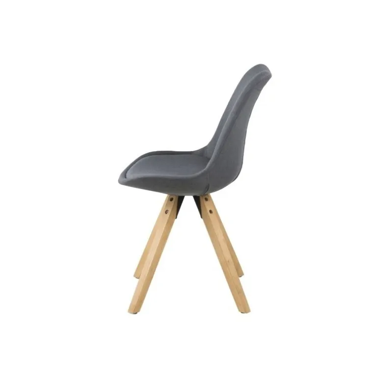Moderne spisebordsstol med formstøbt polstret sæde og koksgråt tekstillæderbetræk. Stolen hviler stabilt på fire lyse træben, der er behandlet med hvidpigmenteret olie, hvilket giver træet en lækker finish og sikrer en større grad af smudsresistens. Et smart retroinspireret design til det moderne hjem.