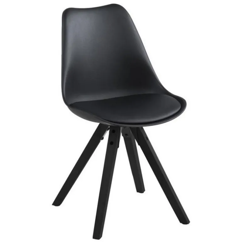 Sæt af 4 moderne spisebordsstole i retrolook med sort plastsæde polstret med skum, og fastmonteret siddehynde betrukket med sort tekstillæderbetræk. Stolen hviler på fire sortmalede ben i gummitræ.