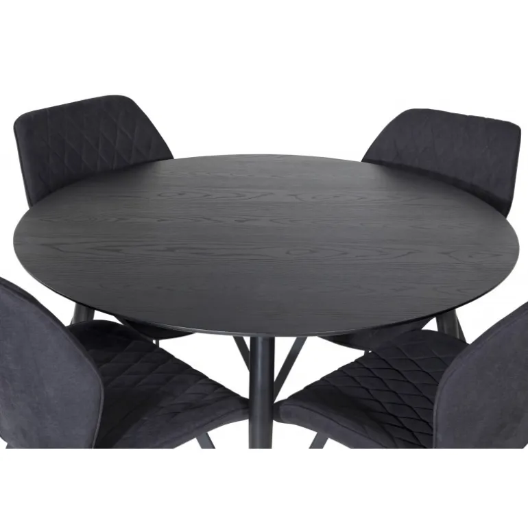 Dip, moderne og elegant rundt spisebord – her sammen med sorte spisebordsstole i fløjl fra Gemme-serien. Skab noget smukt og socialt til god mad og hyggelige stunder! Dette sæt kombinerer stilfuldt design med funktionalitet, hvilket gør det ideelt til både hverdagsbrug og særlige lejligheder. Med sorte stole i fløjl og et sort bord, er dette sæt perfekt til at skabe en sofistikeret atmosfære i dit hjem.