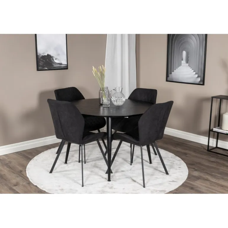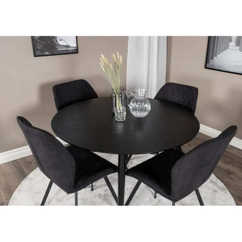 - Moderne Design: Stilfuldt rundt spisebordssæt med sorte stole i fløjl.