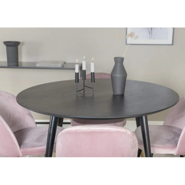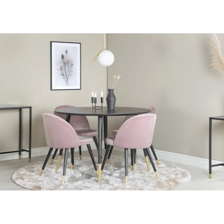 Dipp Rund Spisebordssæt kombinerer moderne design med stilfulde materialer for at skabe det perfekte midtpunkt i dit hjem. Dette sæt inkluderer en rund spisbord og stole betrukket med polyesterfløjl, der passer perfekt til både klassiske og moderne indretninger. Med en sort bordplade og stole i støvet pink, tilføjer dette sæt en sofistikeret touch til enhver spisestue.