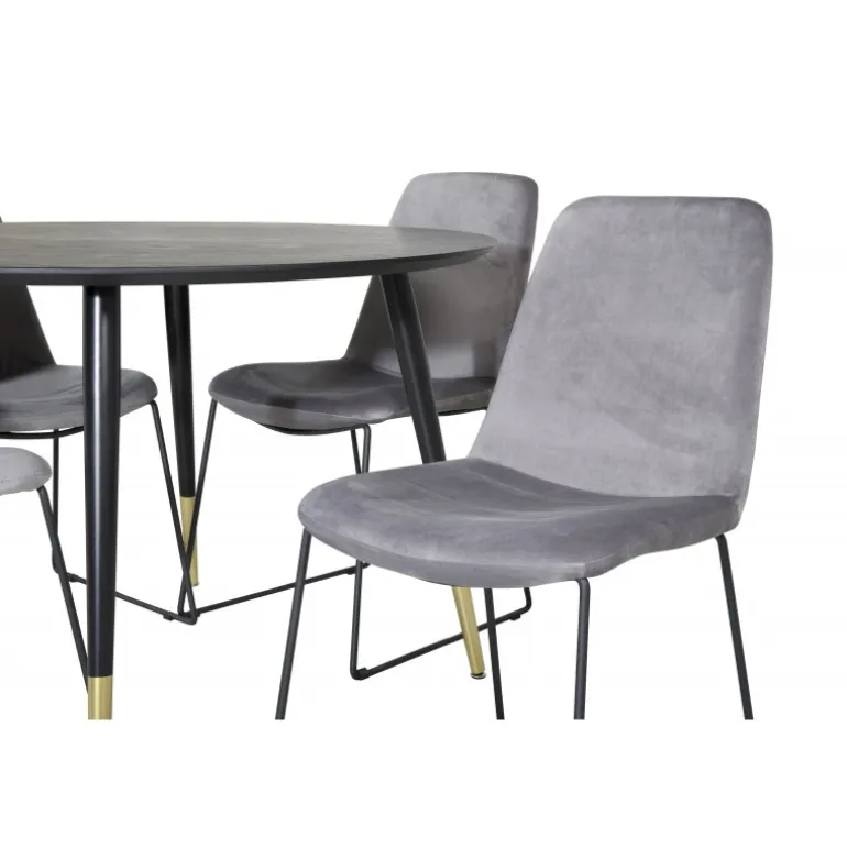 Oplev det klassiske Dipp Rundt Spisebordssæt, der passer perfekt ind i de fleste hjem! Dette Spisebordssæt kombinerer en elegant rund spisebord med komfortable stole fra Muce-serien. Perfekt til dem, der ønsker at skabe en hyggelig og moderne atmosfære i hjemmet. Bordet og stolene er fremstillet af kvalitetsmaterialer som bøjetræ, skum, MDF og stål, hvilket sikrer holdbarhed og stil. Tilgængelig i farverne sort, guld og grå for at matche enhver indretning.