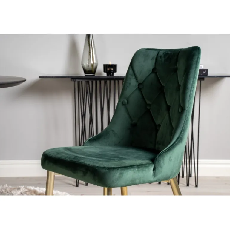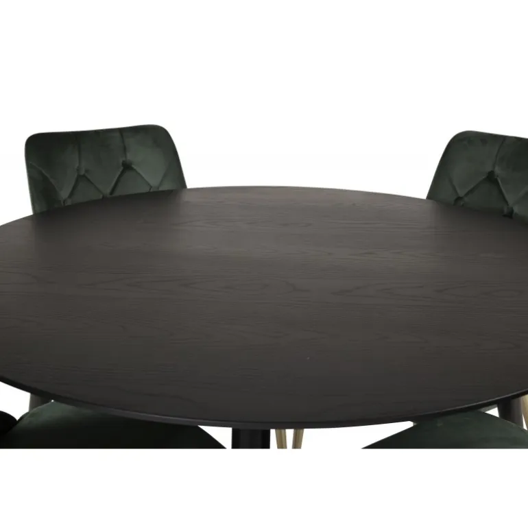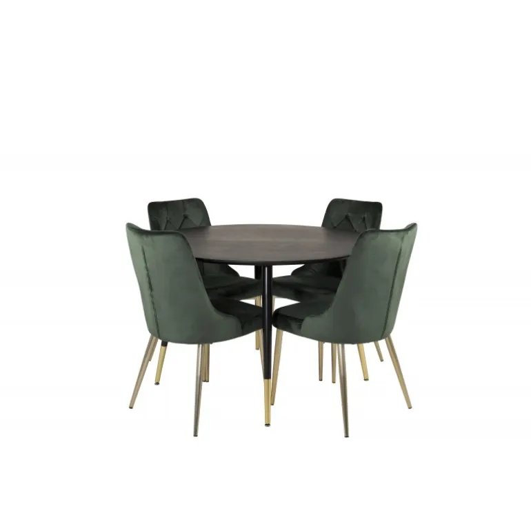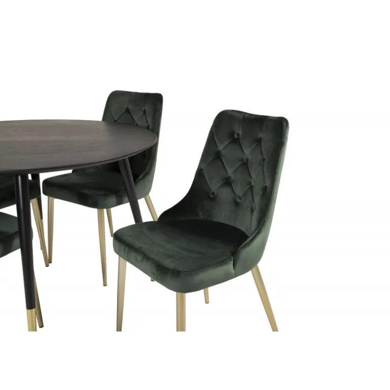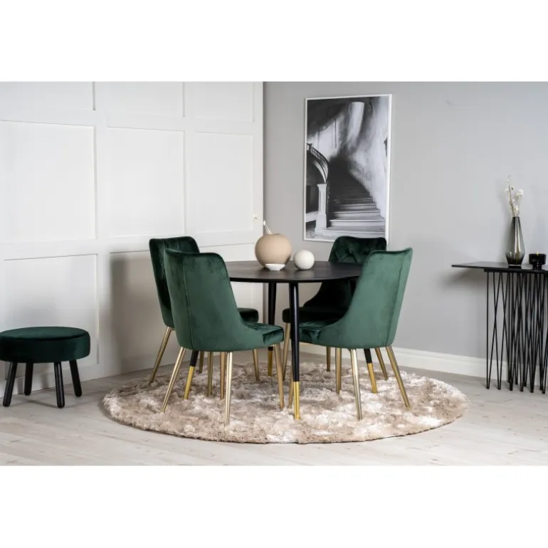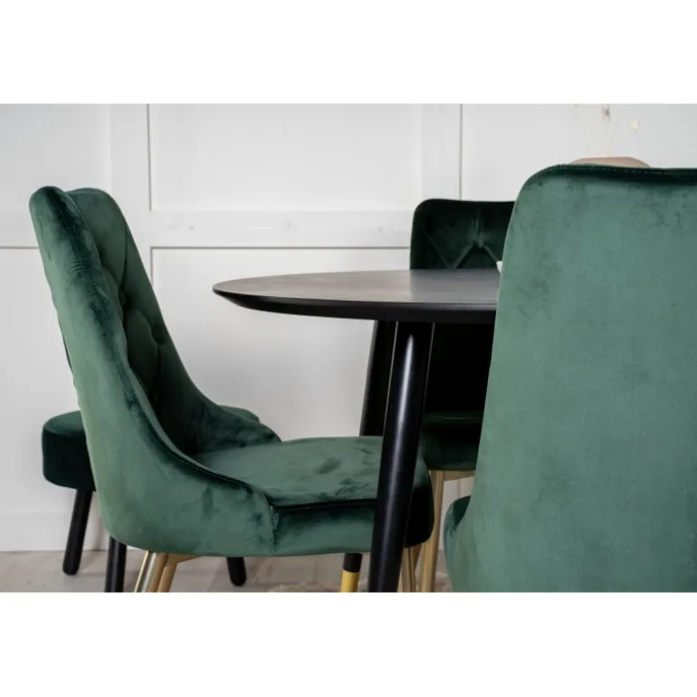 Det stilfulde Dipp Rundt Spisebordssæt kombinerer den elegante spisebord fra Dipp-serien med de komfortable og stilfulde spisebordsstole fra Velvet-serien. Kombinationen skaber en hyggelig og moderne følelse i hjemmet. Bordpladen i MDF med sort finish matcher perfekt med de grønne og guldfarvede stole, hvilket giver et luksuriøst touch til din spisestue. Dette sæt er ideelt til dem, der ønsker både komfort og stil i deres hjem.