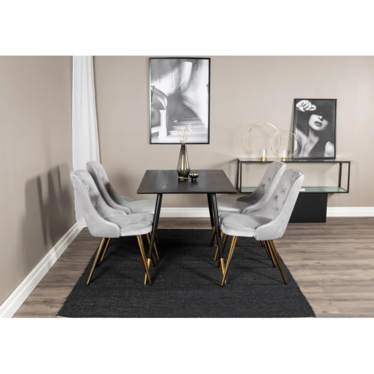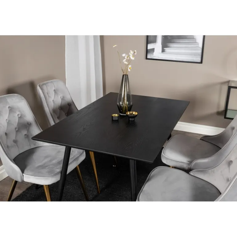 Et elegant Spisebordssæt, der indgyder en luksuriøs og moderne følelse! Trendy gulddetaljer møder blød velour i denne perfekte kombination – spisebordet Dipp sammen med grå velourstole i serien Velvet. Lad dig og din indretning inspirere af denne trendsikre Spisebordssæt, der er fantastisk til både hverdag og fest.