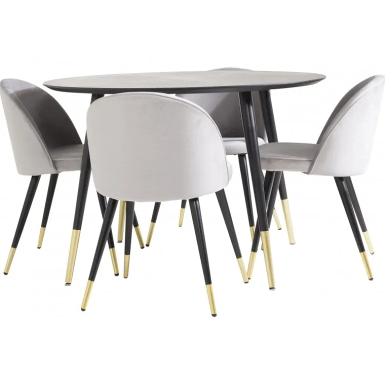 Oplev den perfekte kombination af stil og funktionalitet med Dipp Rund Spisebordssæt. Dette sofistikerede Spisebordssæt inkluderer et elegant rundt spisebord og fire komfortable stole, alle med smukke guld-detaljer på benene. Bordet i sort finish og de grå Velvet-stole skaber et moderne og luksuriøst look, der er ideelt til ethvert hjem. Dipp Rund Spisebordssæt er fremstillet af kvalitetsmaterialer som MDF, stål og polyester fløjl, hvilket sikrer både holdbarhed og komfort.