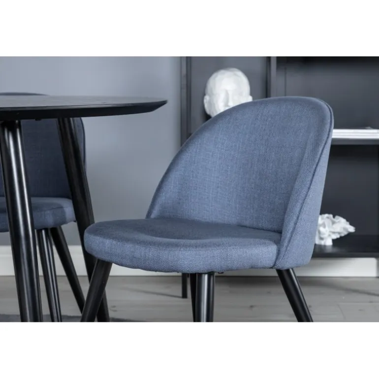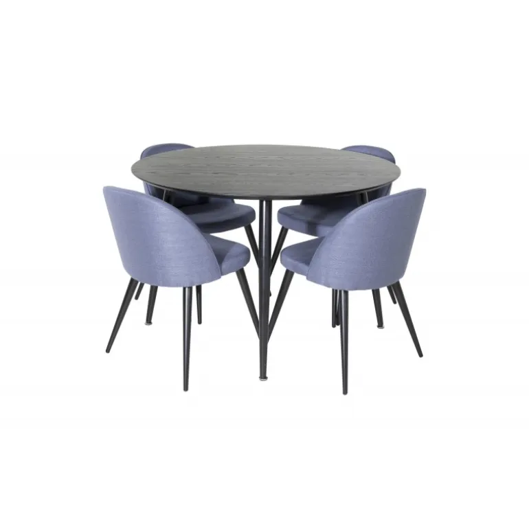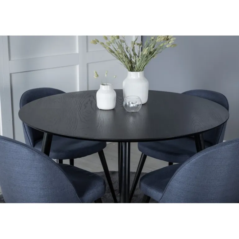 Opgrader din spisestue med Dipp Rundt Spisebordssæt. Dette moderne og stilfulde Spisebordssæt inkluderer et rundt spisebord og Velvet spisestole, der tilsammen skaber den perfekte kombination til hjemmets hjerte. Med sit sofistikerede design og høj kvalitet passer sættet perfekt til dine behov og komplementerer din øvrige indretning. Spisebordet og stolene er lavet af holdbare materialer som bøjetræ, MDF og stål, hvilket sikrer langvarig brug og stabilitet. Fås i sort og blå farver.