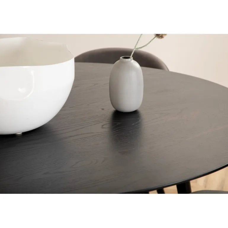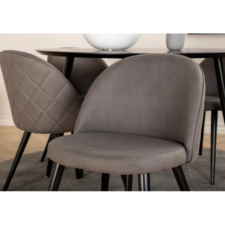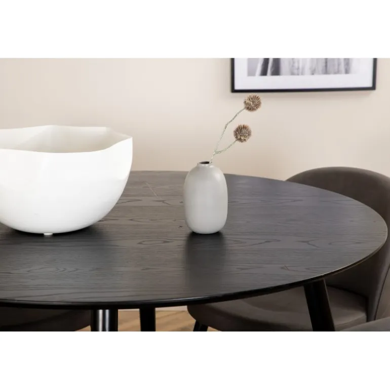 Skab et charmerende midtpunkt for dig og din familie! Vores runde spisebord i Dip-serien har en stilfuld bordplade i MDF og let udstillede metalbordben. Bordet er i en konsekvent sort farve, der giver rummet et moderne og luksuriøst udseende. Her sammen med måtter fra serien Velvet Stitches i grå mikrofiber. Stolebenene er let udstillede i sort jern og matcher bordet perfekt. Nyd behagelige måltider fremover!