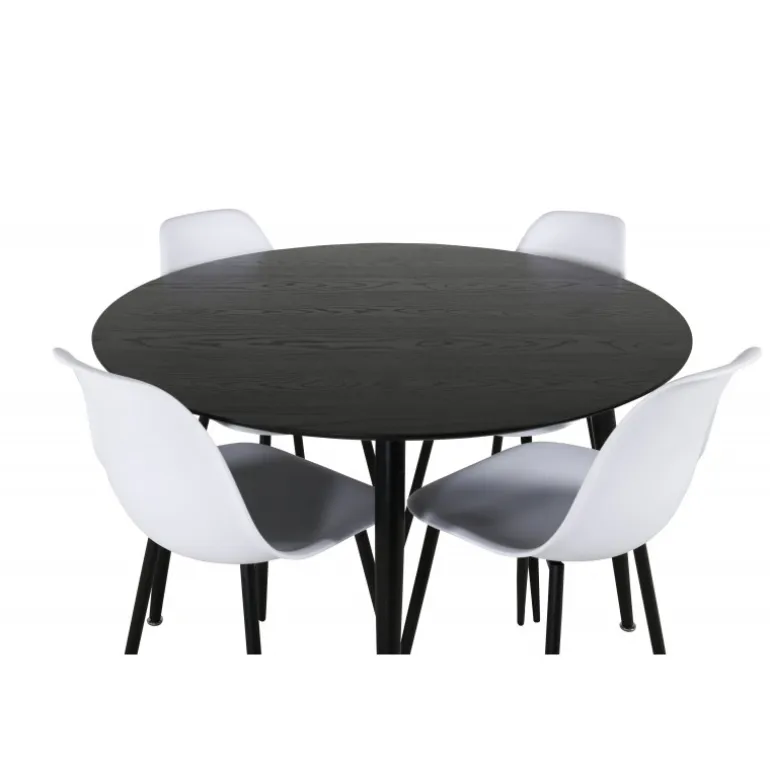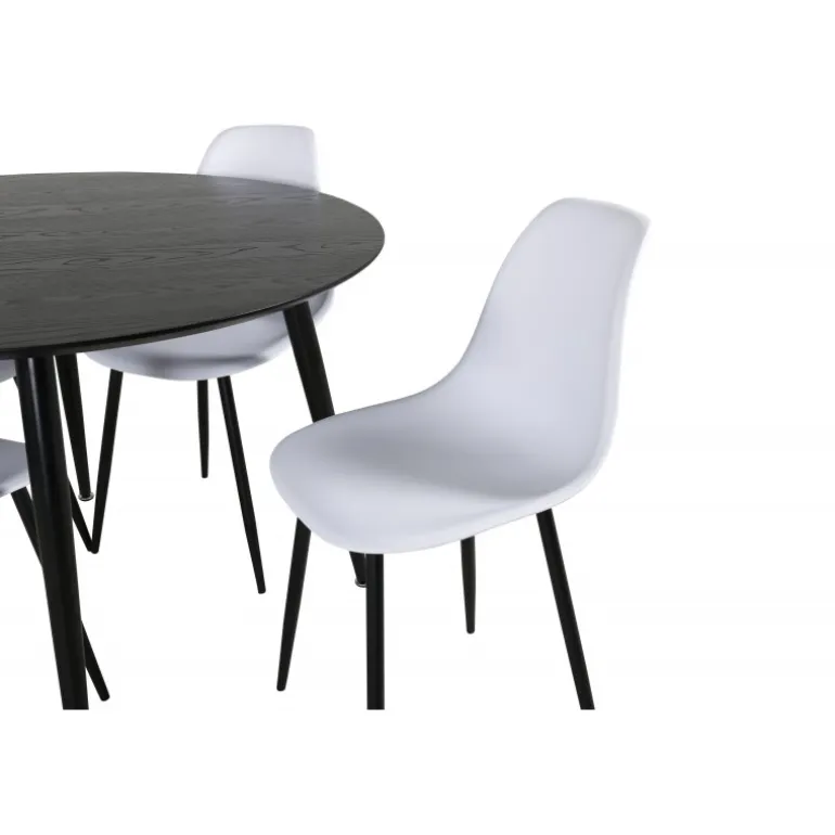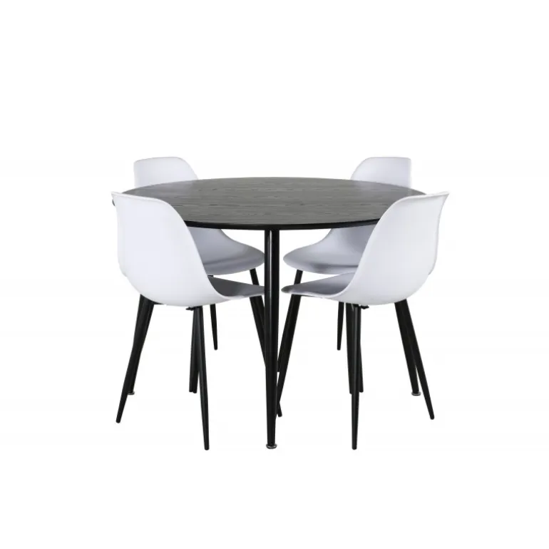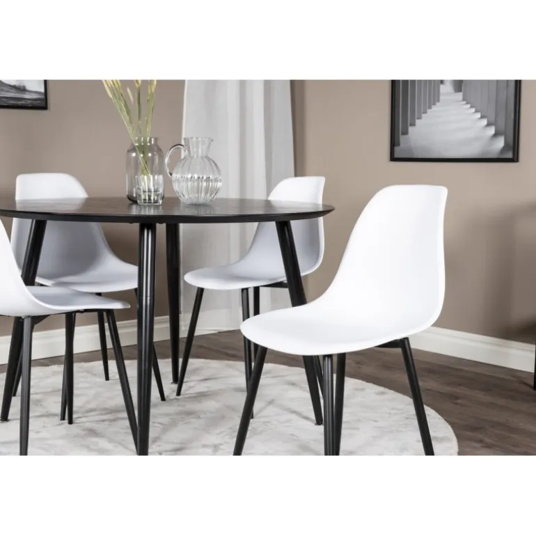 Dipp Rundt Spisebordssæt er den perfekte tilføjelse til dit hjem, hvor moderne design møder funktionalitet. Dette sæt inkluderer et elegant, rundt spisebord fra Dipp-serien kombineret med stilfulde stole fra Polar-serien. Skab en hyggelig og social atmosfære med plads til god mad og samvær. Bordpladen er lavet af MDF med en sort finish, mens stolene er fremstillet af plastik og stål for en holdbar og moderne løsning. Montering kræves, så du kan nyde et personligt touch på dit nye møbel.