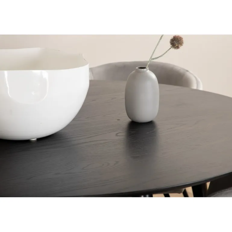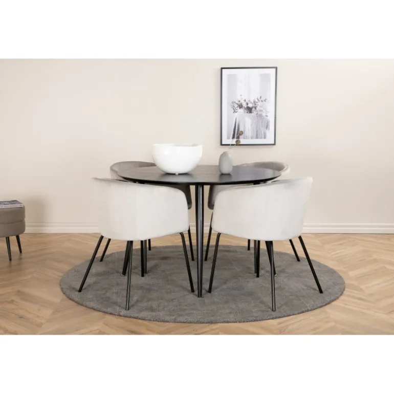 Skab et charmerende midtpunkt for dig og din familie at samles omkring! Vores runde spisebord i Dipp-serien har en stilfuld bordplade i MDF og let udadbuede metalbordben. Bordet er gennemgående i sort farve, hvilket giver en moderne og luksuriøs følelse til rummet. Her i perfekt kombination med 4 Berit spisebordsstole i luksuriøst design. Sædet er pompøst i grå velour og stolens ben er stilfuldt smalle i sort jern. Sid behageligt og nyd hyggelige måltider.