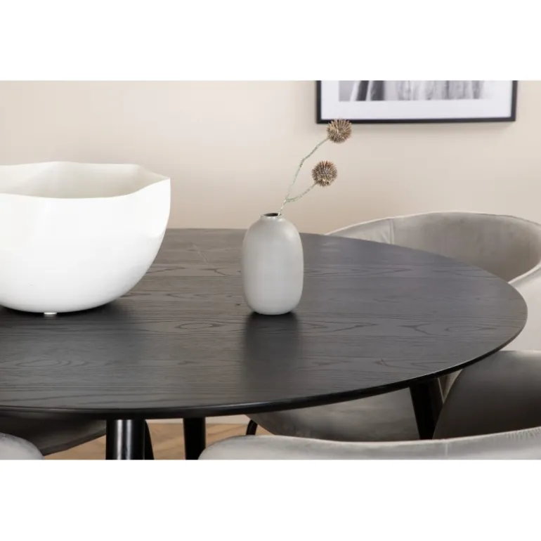 - Moderne design: Elegant sort bord og stilfulde grå velourstole.