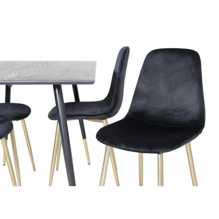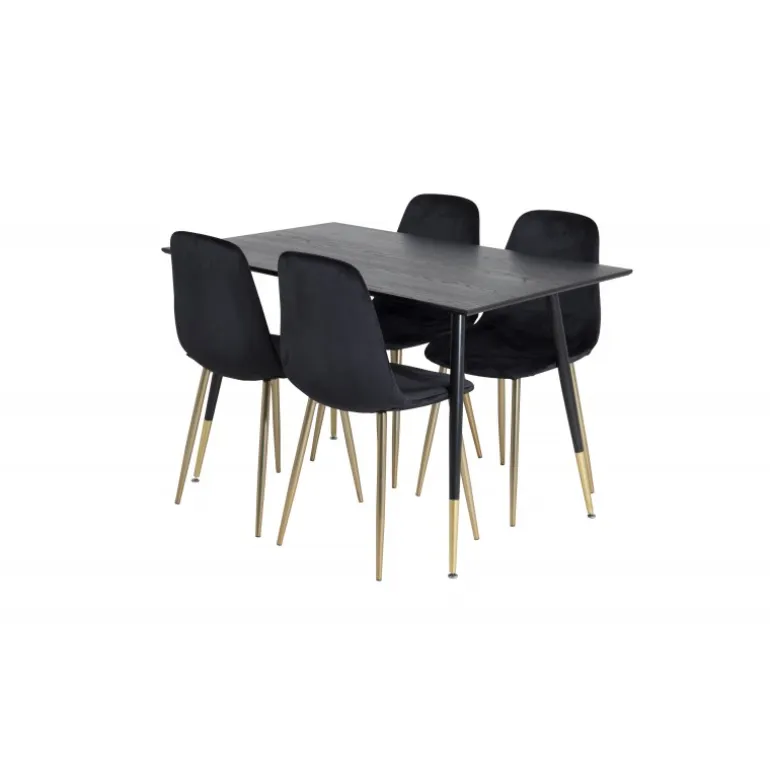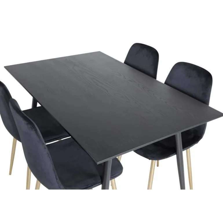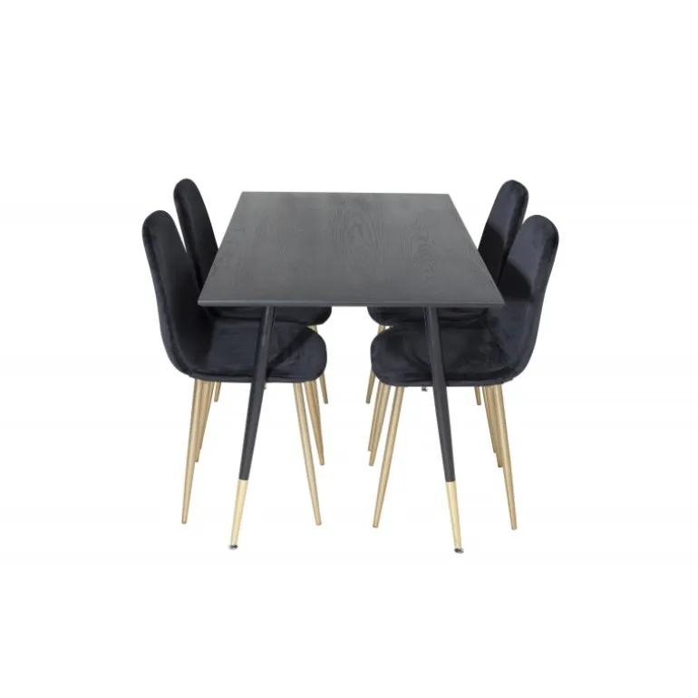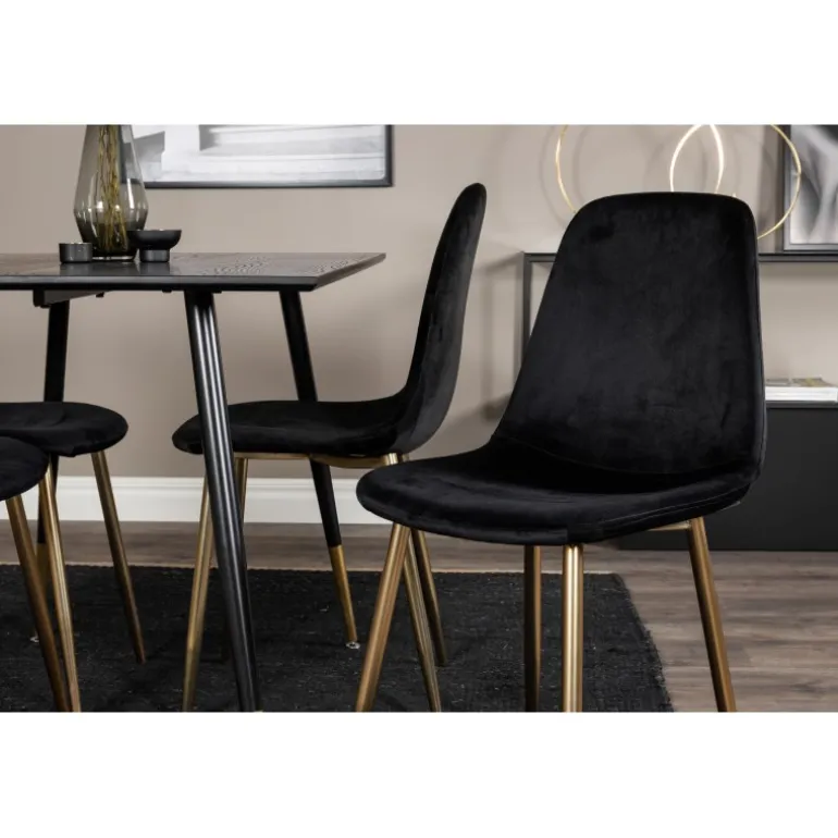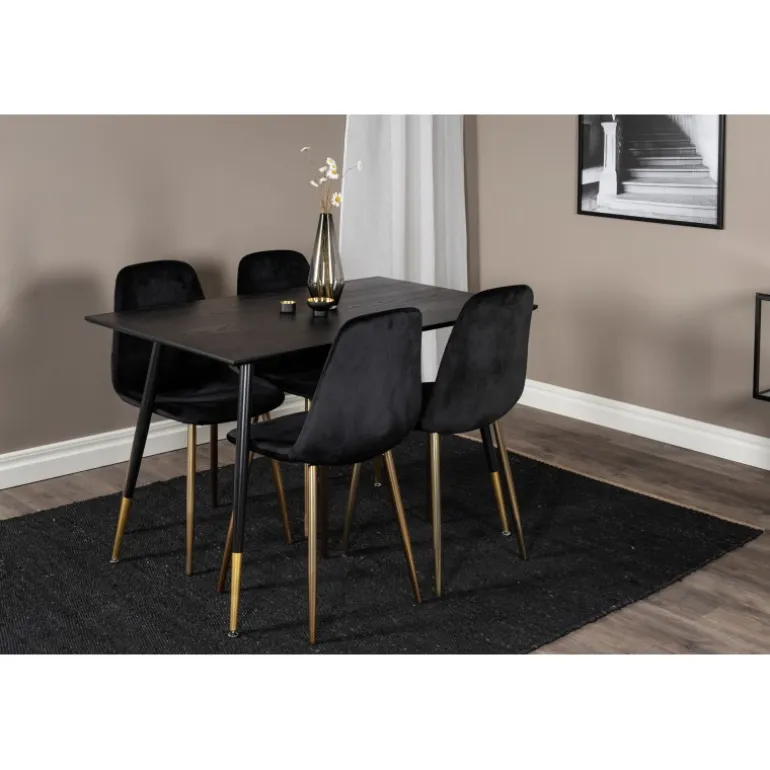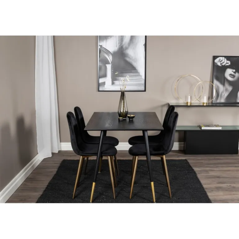 Sort + guld = elegance! Sort madbord med gulddetaljer i serien Dipp sammen med pompøse sorte velourstole i serien Polar er garanteret et blikfang i rummet. Perfekt til at tilføje et strejf af luksus til din spiseplads. Dette sæt kombinerer stil og funktionalitet, hvilket gør det til et ideelt valg for dem, der ønsker at imponere gæsterne. Med materialer af høj kvalitet som MDF, krydsfiner og stål, er det både robust og holdbart. Samlingen kræves, men resultatet er værd at indsatsen.