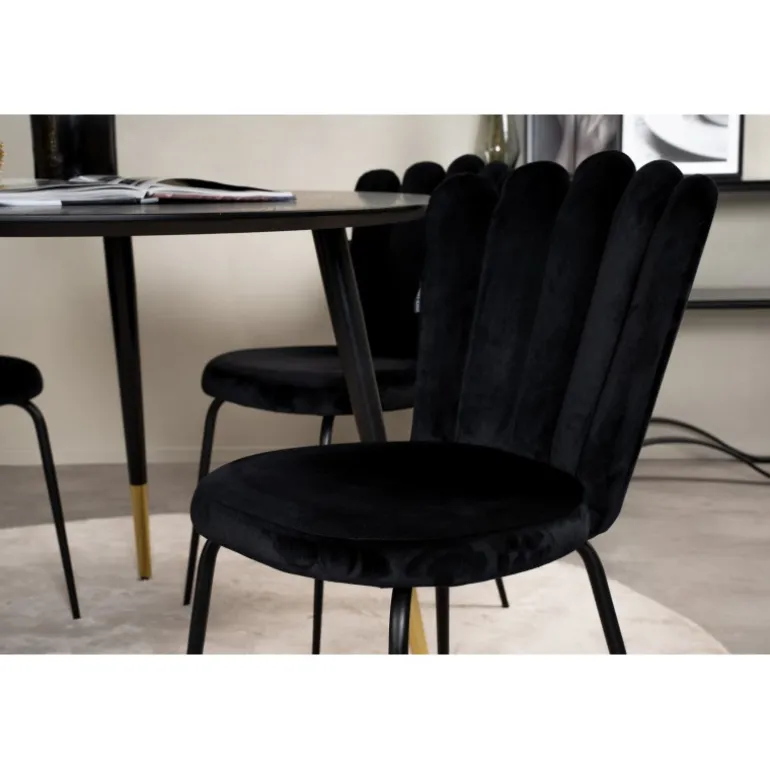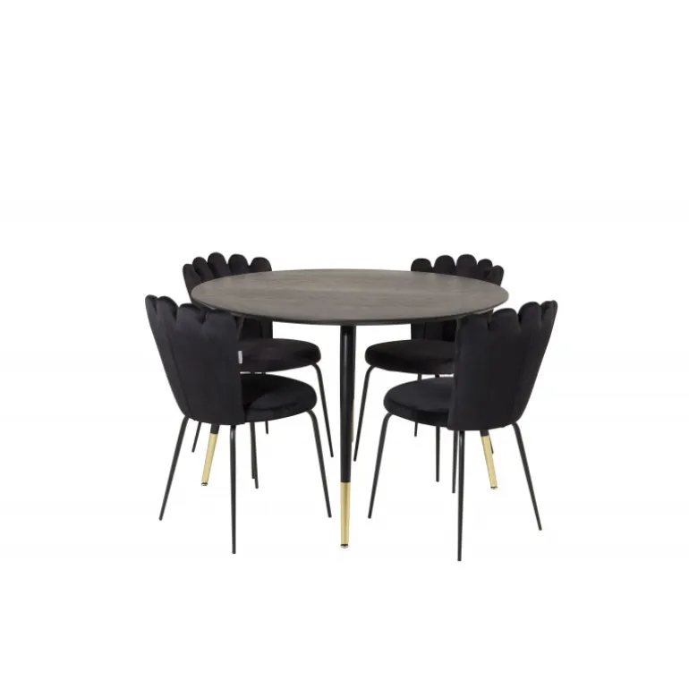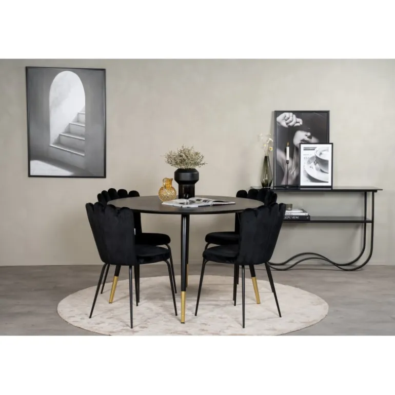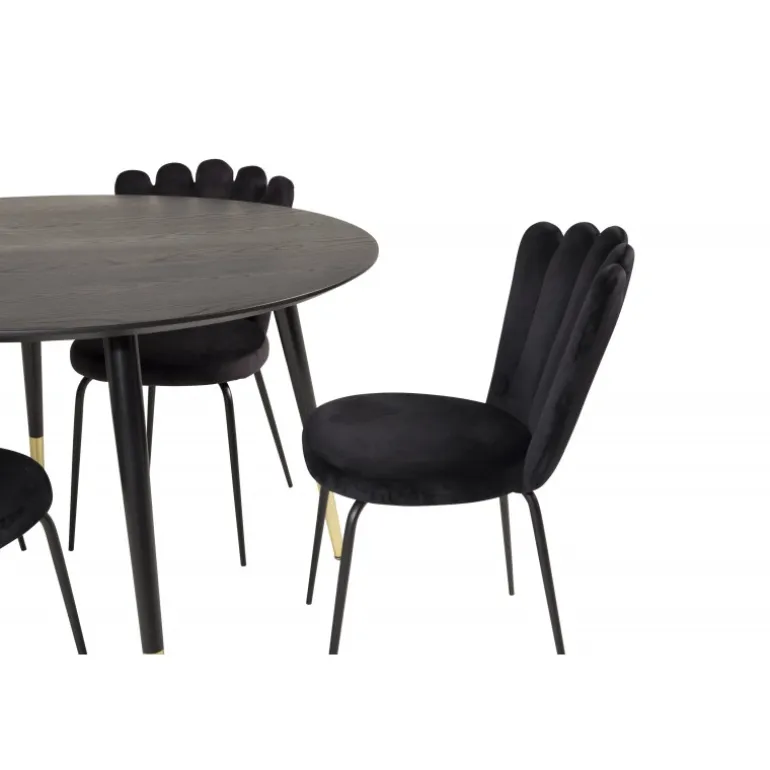 Oplev elegance og stil med Dipp Rundt Spisebordssæt. Dette sæt indeholder et sort spisebord med flotte guldfarvede benafslutninger og sorte spisebordsstole fra Limhamn-serien. Stolene har unikke ryglæn, der giver sættet et moderne og unikt udtryk. Perfekt til at skabe en sofistikeret atmosfære i dit hjem.