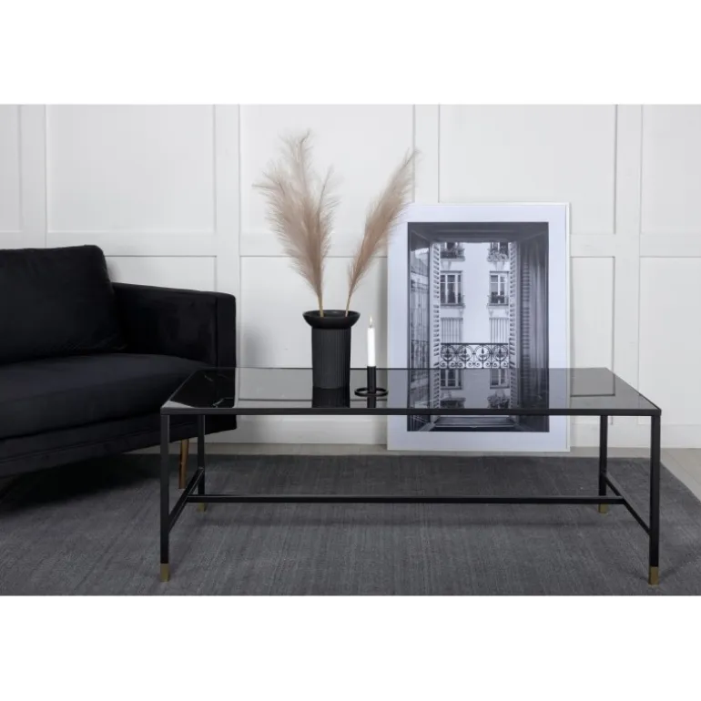 Dipp Bordet har en let mønstret glastop og en sort metalramme med messingbenafslutning. De lige nordiske former og det luftige design skaber et stilfuldt indtryk i stuen, mens de velovervejede detaljer gør bordet unikt. Placer det på et hyggeligt tæppe foran sofaen for et varmere indtryk og pynt med smukke dekorationer for at skabe en hjemlig stue. Bordet fås også i en mindre størrelse.
