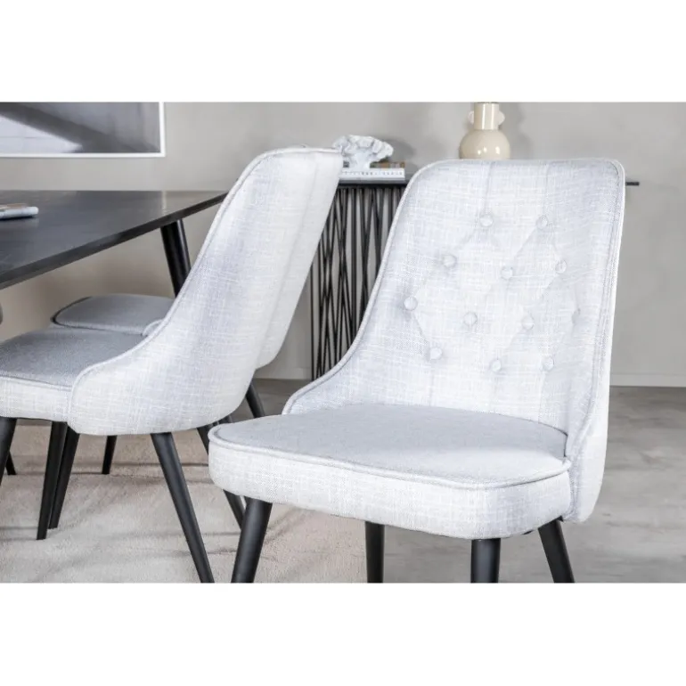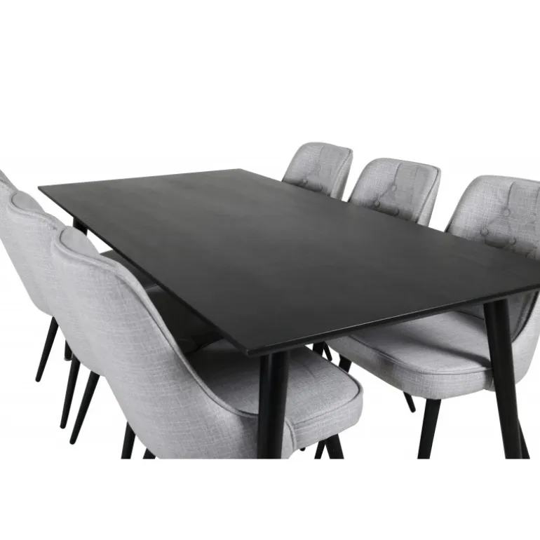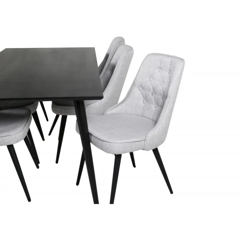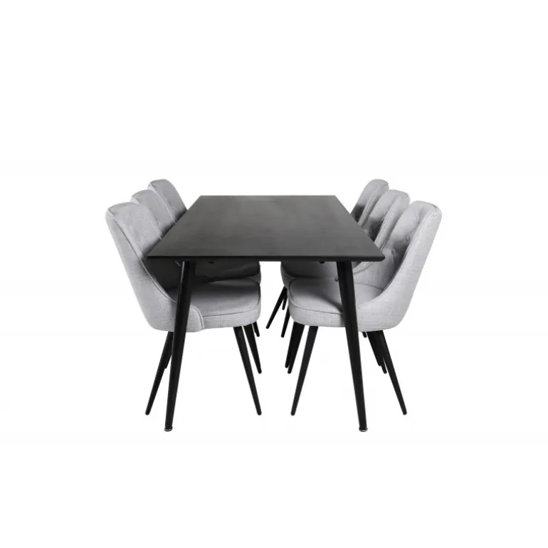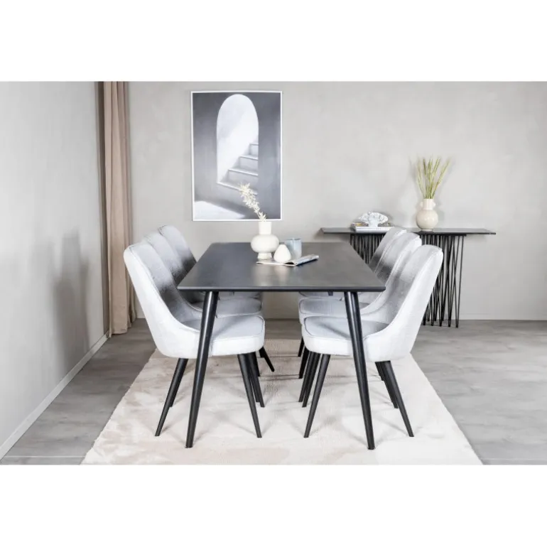 Lad dette smukt matchede spisestuesæt med en moderne følelse blive et naturligt samlingspunkt i dit hjem. Spisestolene i fløjl tilbyder god komfort, og spisebordet Dipp sikrer, at der er plads til alle. Med en elegant sort bordplade og stole i lysegrå fløjl, tilføjer dette sæt både stil og funktionalitet til din spisestue.