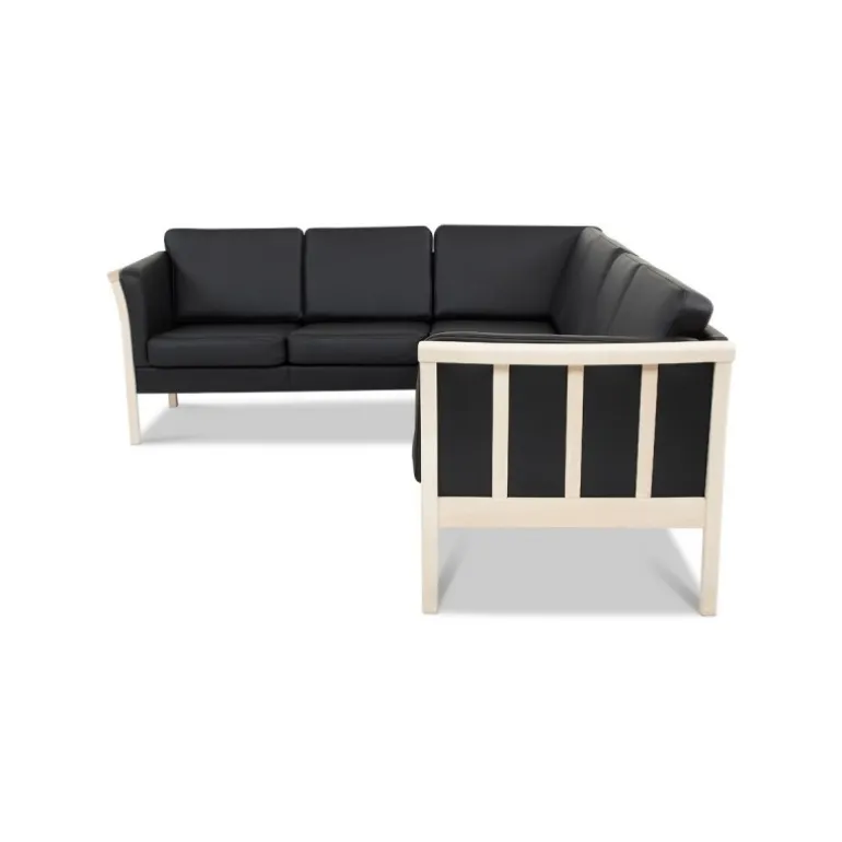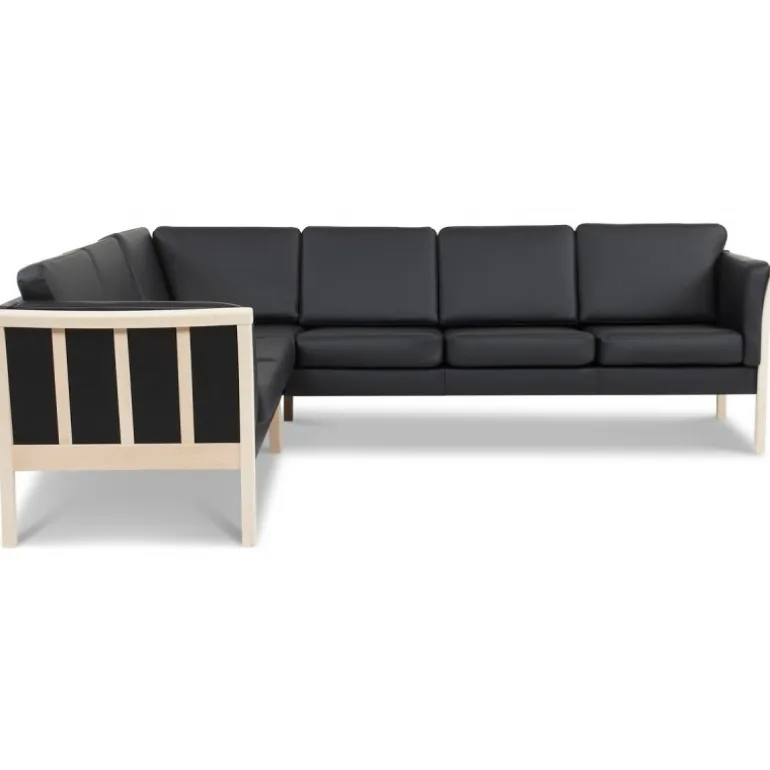 Dragør vendbar hjørnesofa i tidløst kvalitetsdesign, udført med kraftigt sort læder betræk og stilrene ubehandlede tremmegavle i massivt bøgetræ. En klassisk sofa, som udmærker sig med yderst behagelig siddekomfort og enkle, indbydende former. Sofaen kan nemt spejlvendes ved montering.