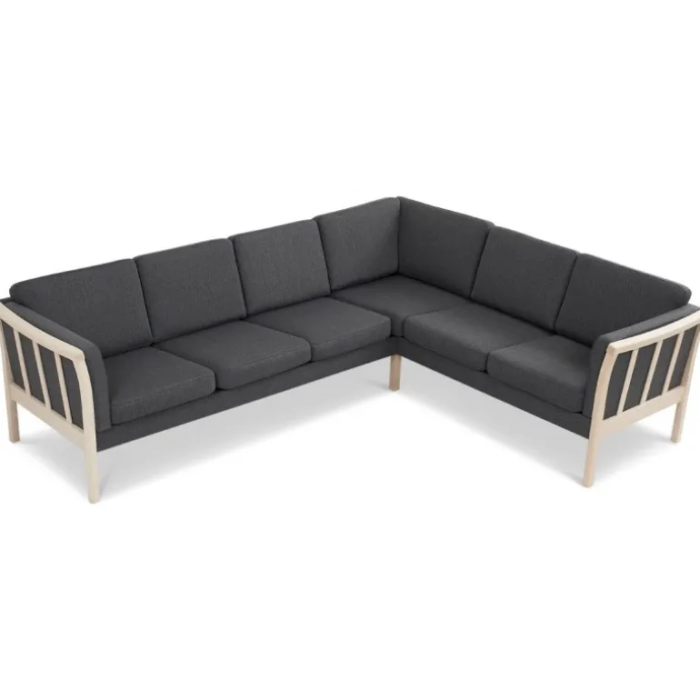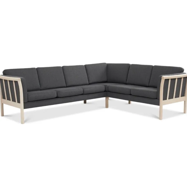 Dragør hjørnesofa i tidløst kvalitetsdesign, udført med kraftigt tekstilbetræk og stilrene ubehandlede tremmegavle i massivt bøgetræ. En klassisk sofa, som udmærker sig med god komfort og enkle, indbydende former. Sofaen kan nemt spejlvendes ved montering.