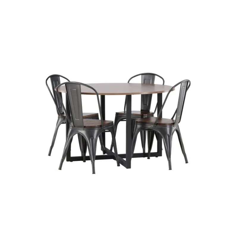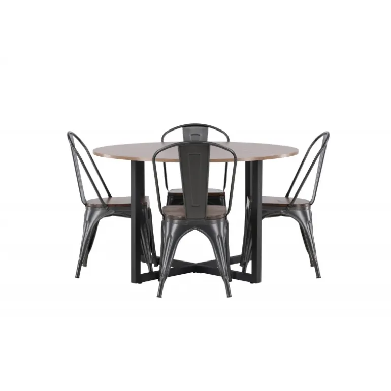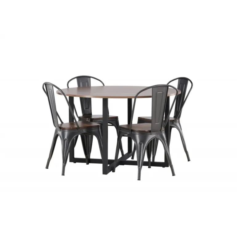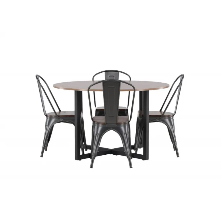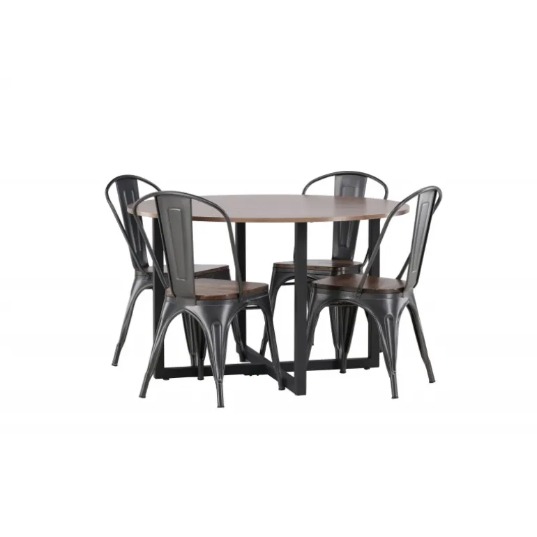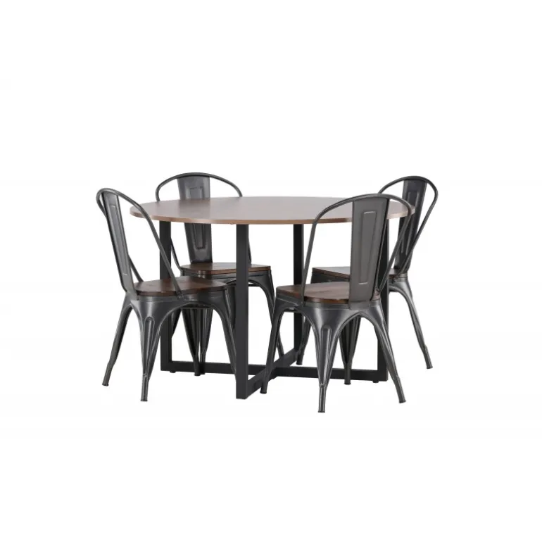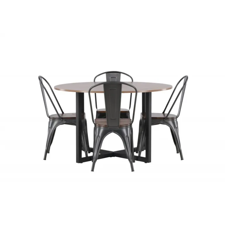 En tidløs Spisebordssæt med bløde former. Vores runde Durango spisebord har en valnød-farvet bordplade i MDF og lige bordben i sort stål, der samles i et kryds på gulvet. Her præsenteres det i en stilfuld kombination med trendy stole fra Tempe-serien. Stolen har et klassisk design af en rustik stol med let udskårne ben i mørkegrå stål og et sæde i mørkt træ. Det er stilfuldt og luksuriøst! Bordets dimensioner: 120 cm.
