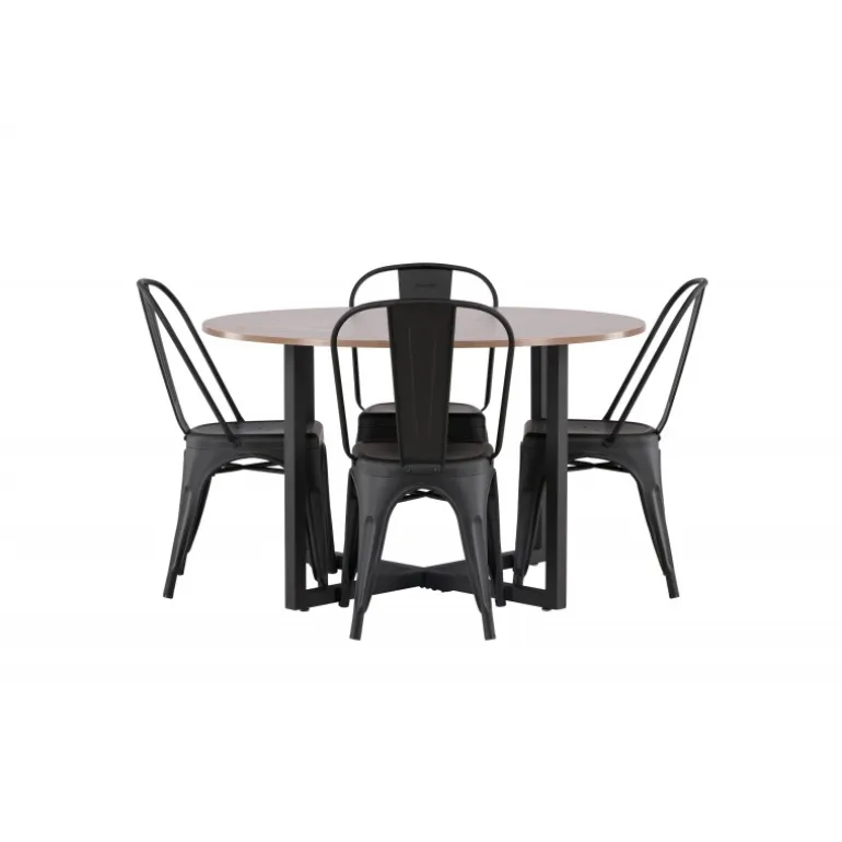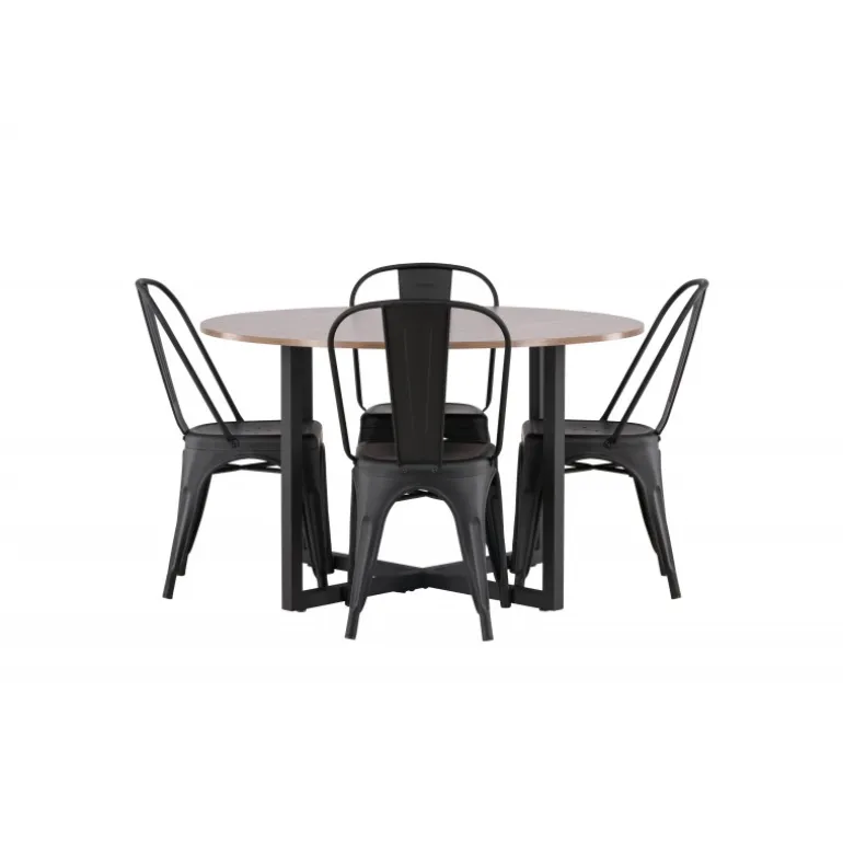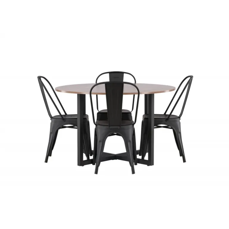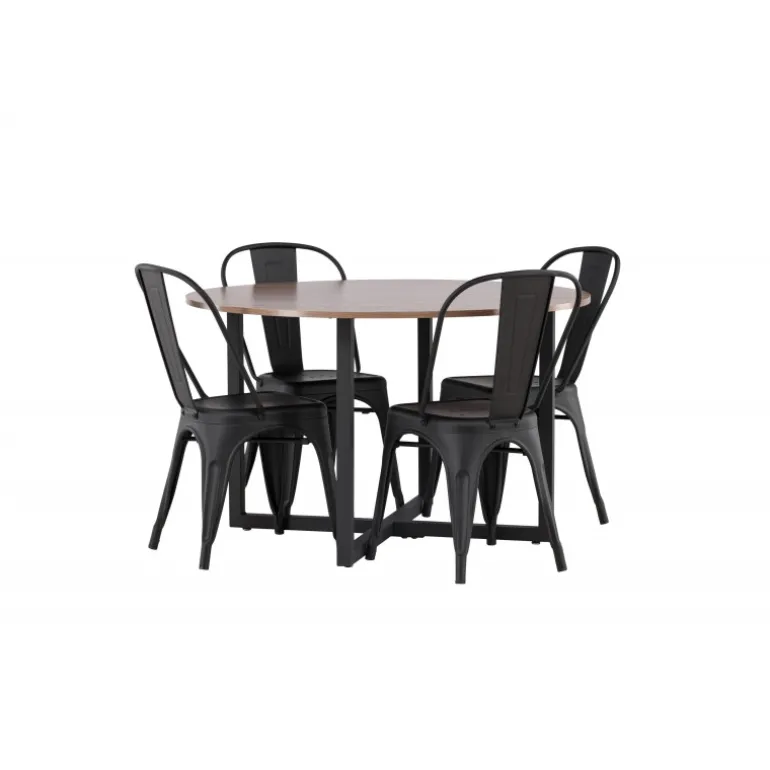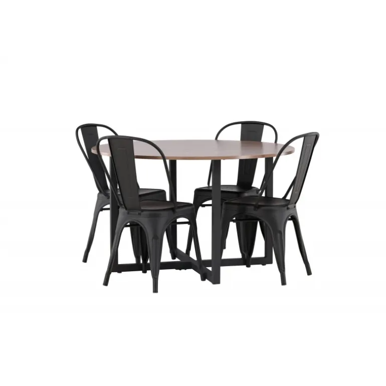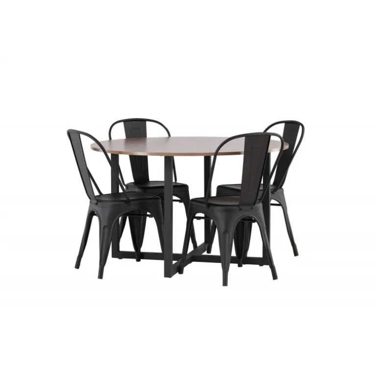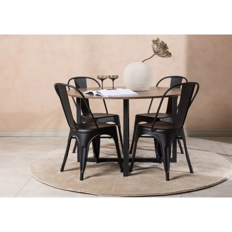 Kombinér jordfarver med trendy former! Vores runde Durango spisebord har en valnøddefarvet bordplade i MDF og lige bordben i sort stål, som samles i et kryds på gulvet. Her sammen med vores sorte spisebordsstole fra Tempe serien. Stolen har let skrånende ben, der smukt møder sædet og ryggen i et stilfuldt design, konsekvent lavet af sort metal. Indret hjemmets hjerte indbydende! Bordets dimensioner: 120 cm.