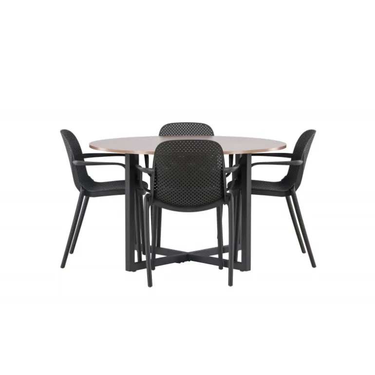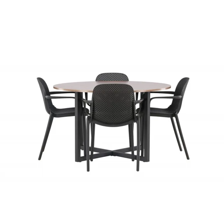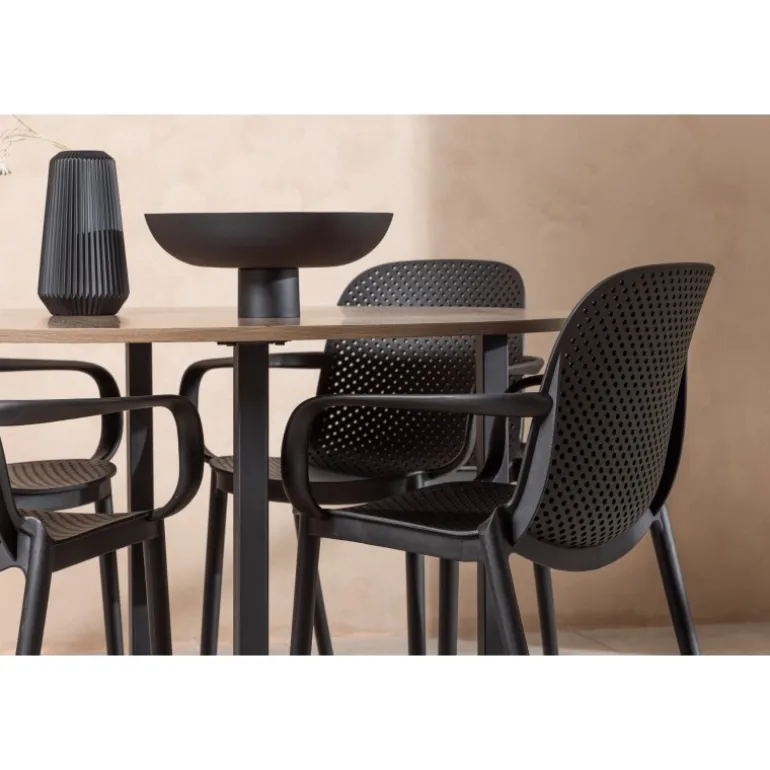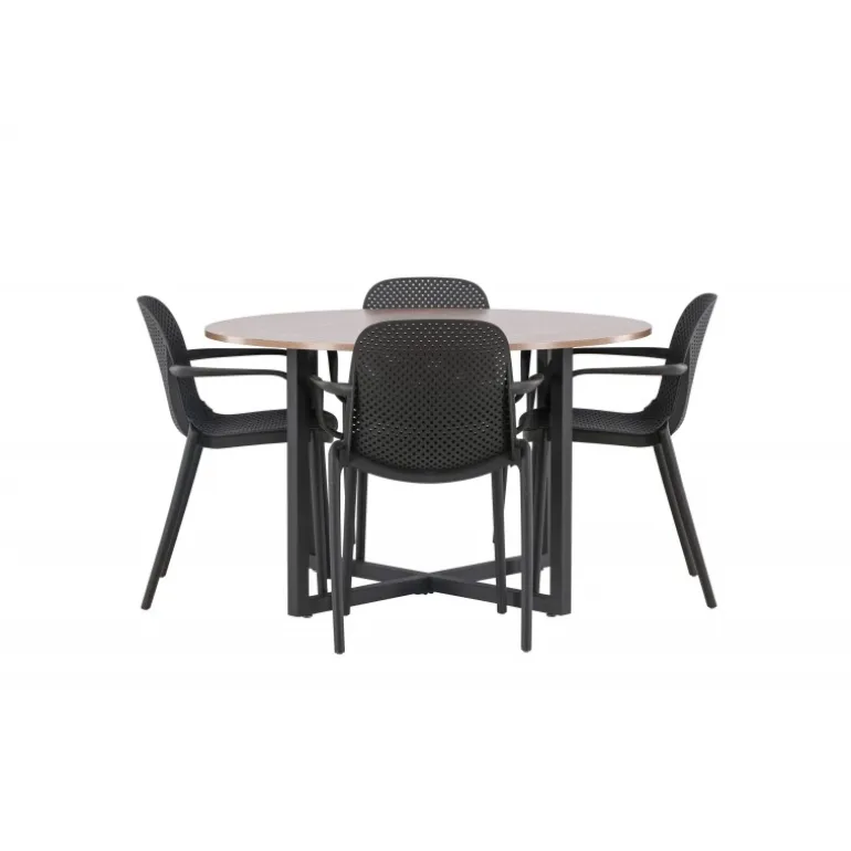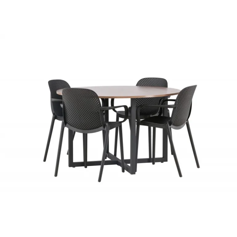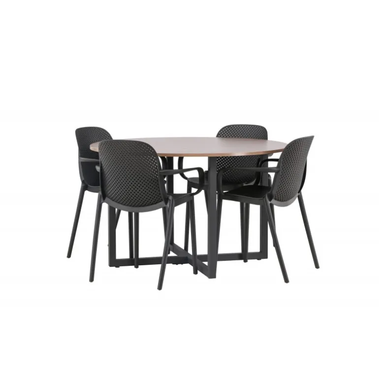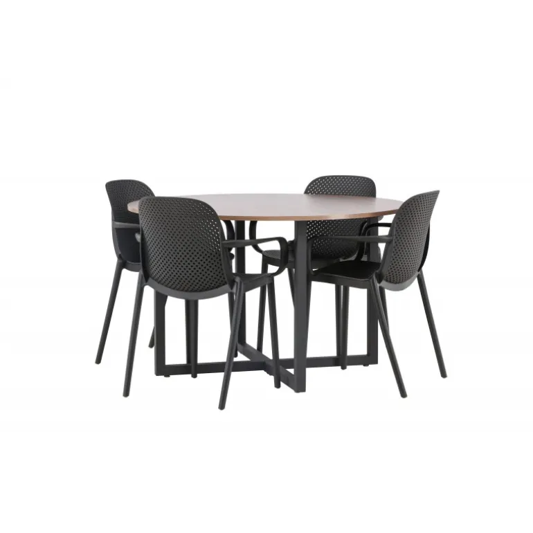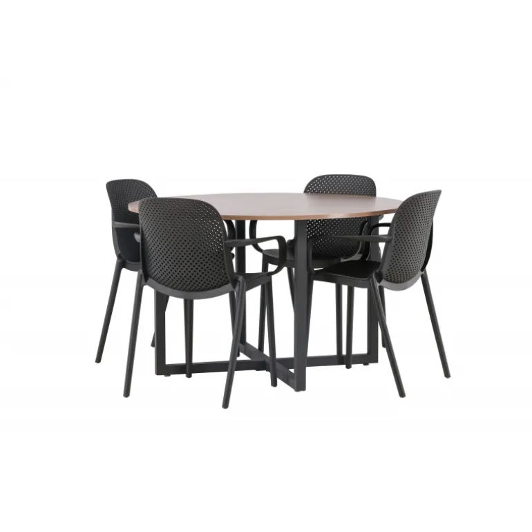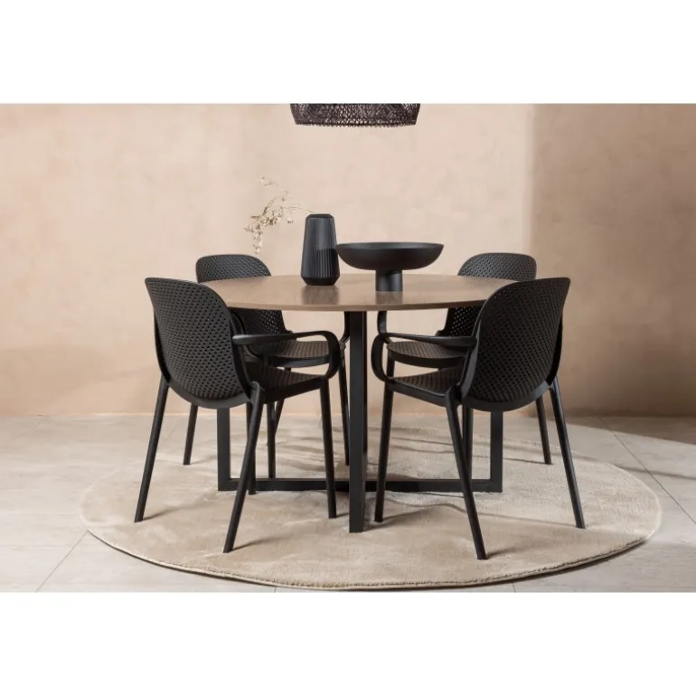 Her mødes industrielt design med bløde former! Vores runde Durango spisebord har en valnøddefarvet bordplade i MDF og lige bordben i sort stål, der samles i et kryds på gulvet. Sammen med vores smarte spisebordsstole fra Baltimore-serien skaber det en trendy og komfortabel spiseoplevelse. Stolen er lavet af sort plast og designet med lige nordiske former og integrerede armlæn for ekstra komfort. Sid behageligt og stilfuldt fremadrettet! Bordmål: 120 cm.