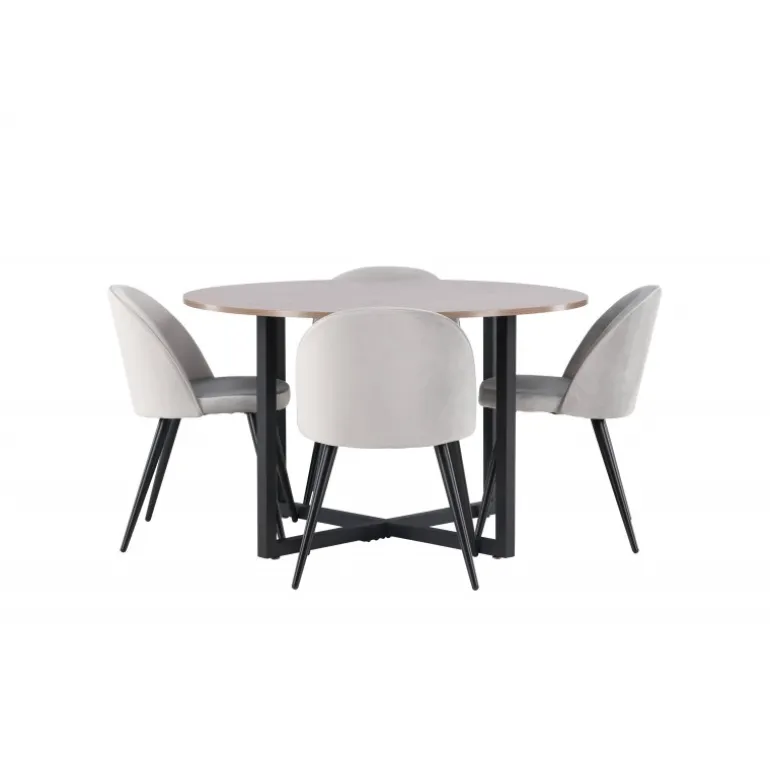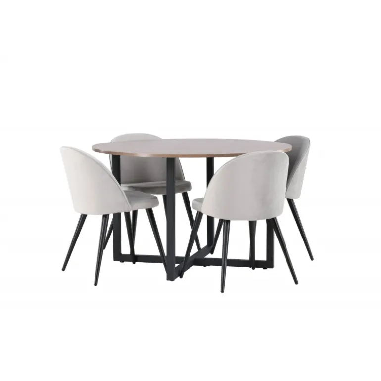 Lyst og frisk – her kombinerer vi behagelige farver og holdbare materialer! Vores runde spisebord Durango har en bordplade i valnød-farvet MDF og lige bordben i sort stål, som samles i et kryds på gulvet. Her i perfekt kombination med vores grå spisebordsstole fra Velvet-serien. Stolen har et fuldt polstret design, ben i sort pulverlakeret metal og afrundet ryg og sæde i grå velourstof med blød polstring. Sid komfortabelt og indret smart! Bordets dimensioner: 120 cm.