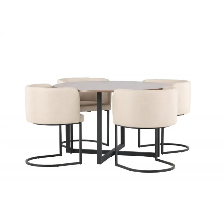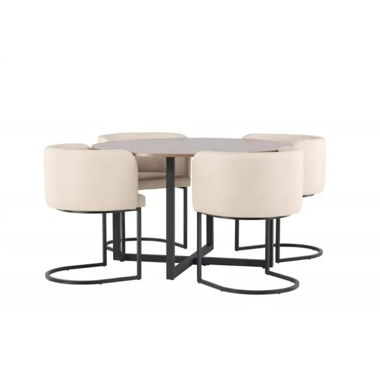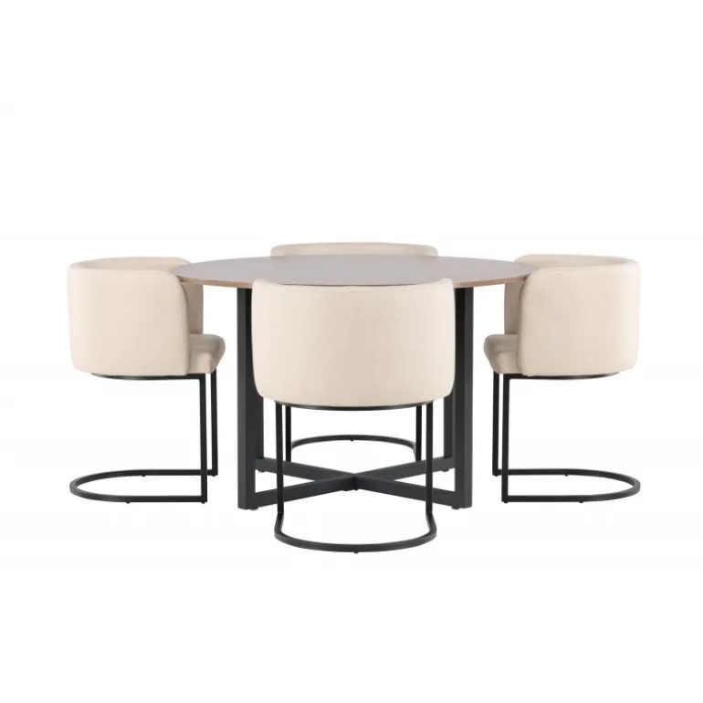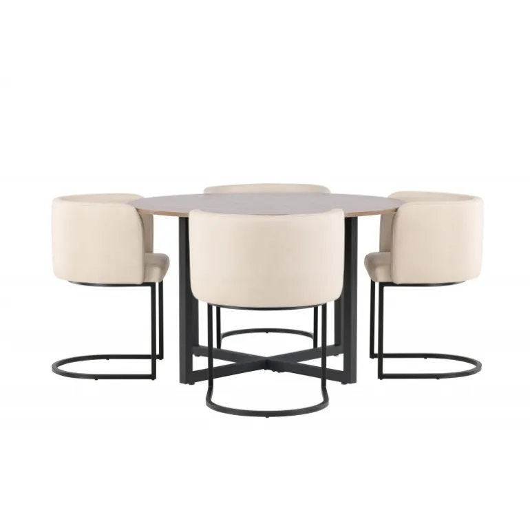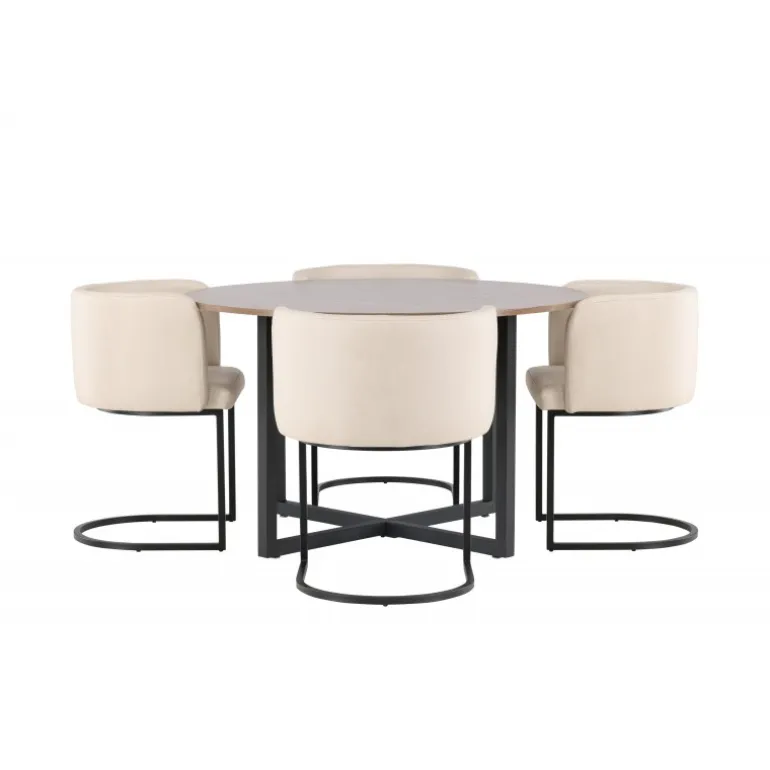 En spisestuegruppe med indbydende former og stilfuldt design! Vores runde Durango spisebord har en valnøddefarvet bordplade i MDF og lige bordben i sort stål, som samles i et kryds på gulvet. Her i vidunderlig kombination med vores luksuriøse spisestuestole Simrishamn. Stolen har et fuldt polstret sæde med en afrundet ryglæn i beige TC-stof og dekorative, minimalistiske ben i sort stål. Skab en storslået og elegant blikfang! Borddimensioner: 120cm.