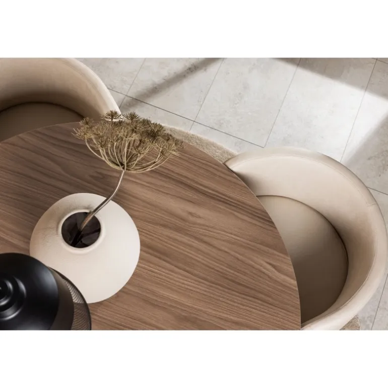 - Rundt bord med valnøddefarvet bordplade i MDF.