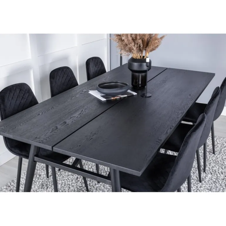 Oplev den perfekte kombination af komfort og stil med vores Elegant Rektangulær Spisebordssæt. Dette klassiske spisebordssæt passer ind i de fleste hjem og er ideelt til dem, der ønsker at skabe en hyggelig og moderne atmosfære. Spisebordet fra Sleek-kollektionen sammen med stolene fra Polar-serien giver dit hjem et tidløst og stilfuldt look. Med sin slanke sorte finish og højkvalitets materialer som krydsfiner og stål, tilbyder dette sæt både holdbarhed og elegance. Det kræver samling, men resultatet er bestemt besværet værd.