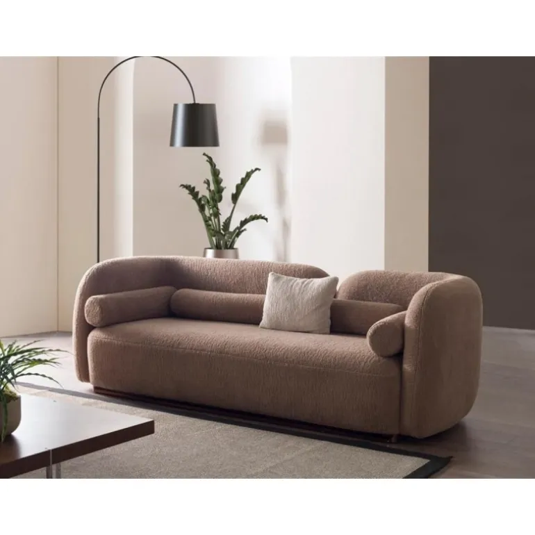 Denne sofa kombinerer et moderne og roligt design med indbydende komfort. De afrundede former og det bløde stof giver et varmt og harmonisk udtryk, som passer smukt ind i både lyse og moderne stuer.