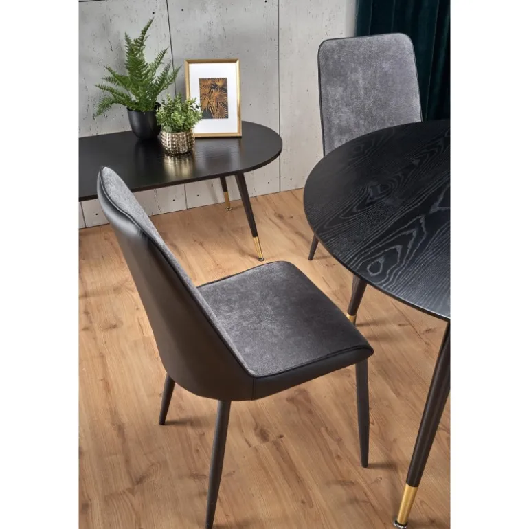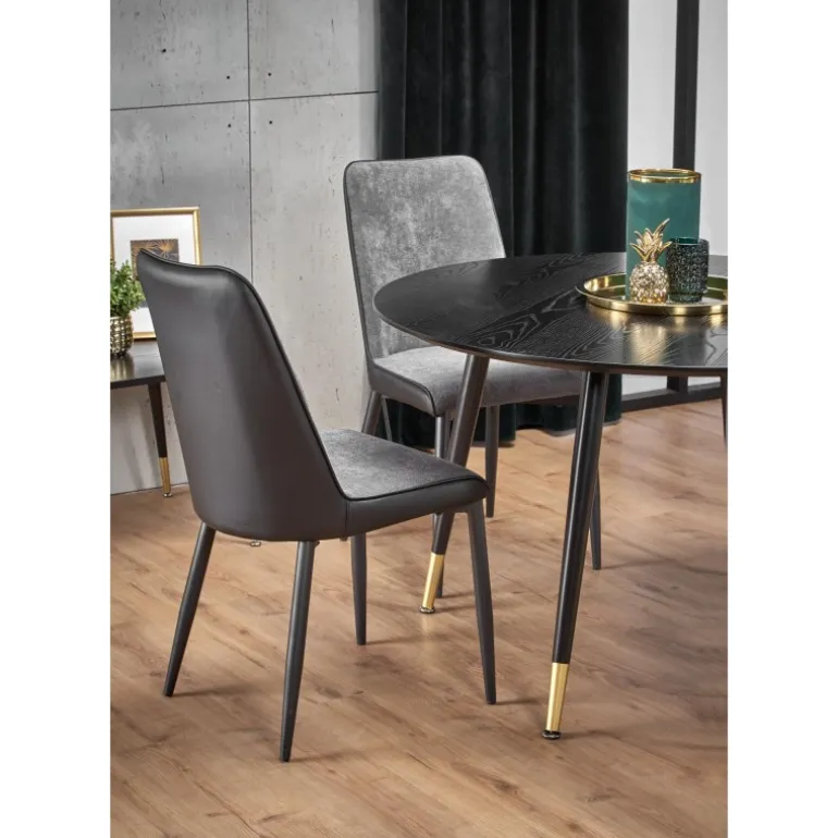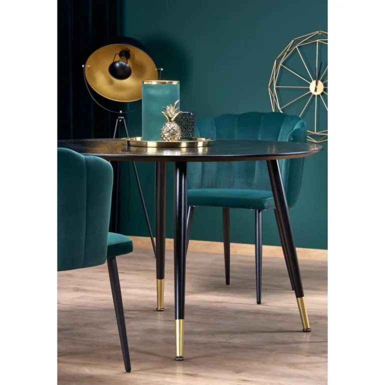 Oplev det elegante EMBOS bord, designet til at tilføre et strejf af sofistikeret stil til dit hjem. Dette moderne bord har en rund top på 120 cm i diameter, fremstillet af lakeret MDF, der giver det en glat og holdbar overflade. Benene er skabt af pulverlakeret og forkromet stål, som sikrer stabilitet og et luksuriøst udseende. Med sin Sorte top og Sorte/guld ben kombinerer EMBOS bordet moderne design med tidløs elegance, perfekt til enhver stue, spisestue eller kontor.