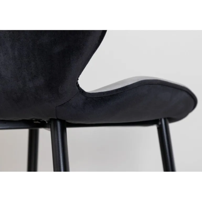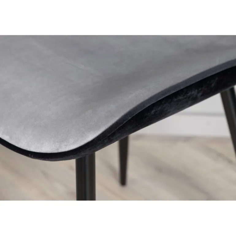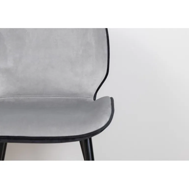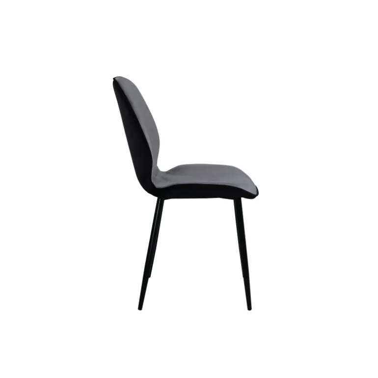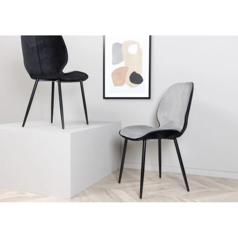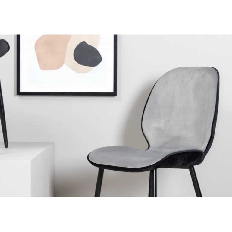 Skab et moderne fokuspunkt i stuen med spisebordsstole fra Emma-serien i et elegant design! Stolen har en glat afrundet form med et sæde i grå fløjl og polyestermateriale samt blødt buede stoleben i sort jern. Ryglænet på stolen er sort, hvilket skaber en trendy kontrast til forsiden. Lad tiden tilbragt her være dagens højdepunkt uden at gå på kompromis mellem komfort og stil!